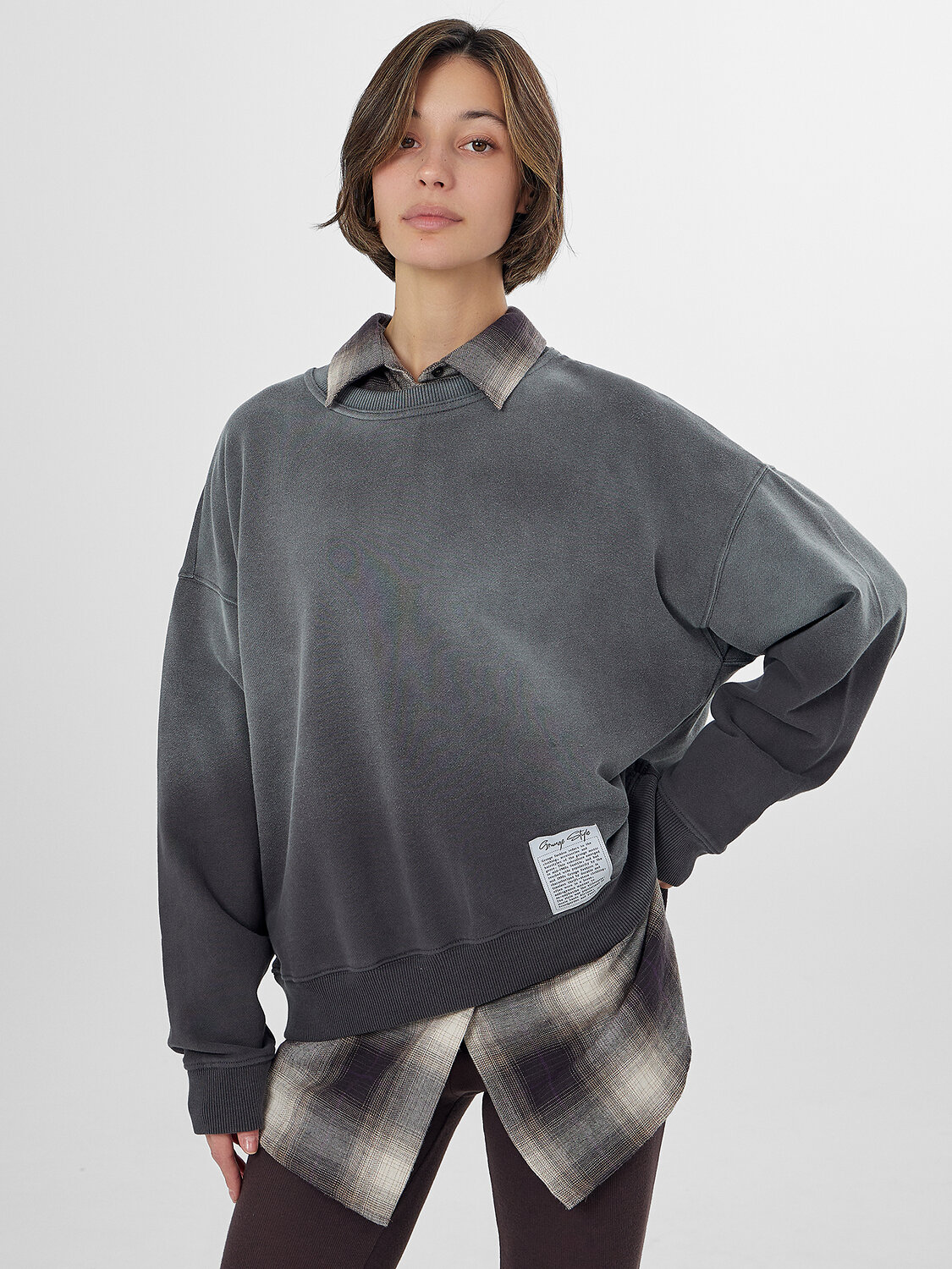 Свитшот выполнен из хлопка — материал обеспечивает воздухообмен и сохраняет мягкость после стирок. Универсальный серый оттенок с графитовым эффектом легко сочетается с джинсами, брюками или юбками. Идеальный выбор для прогулок, встреч с друзьями или отдыха.