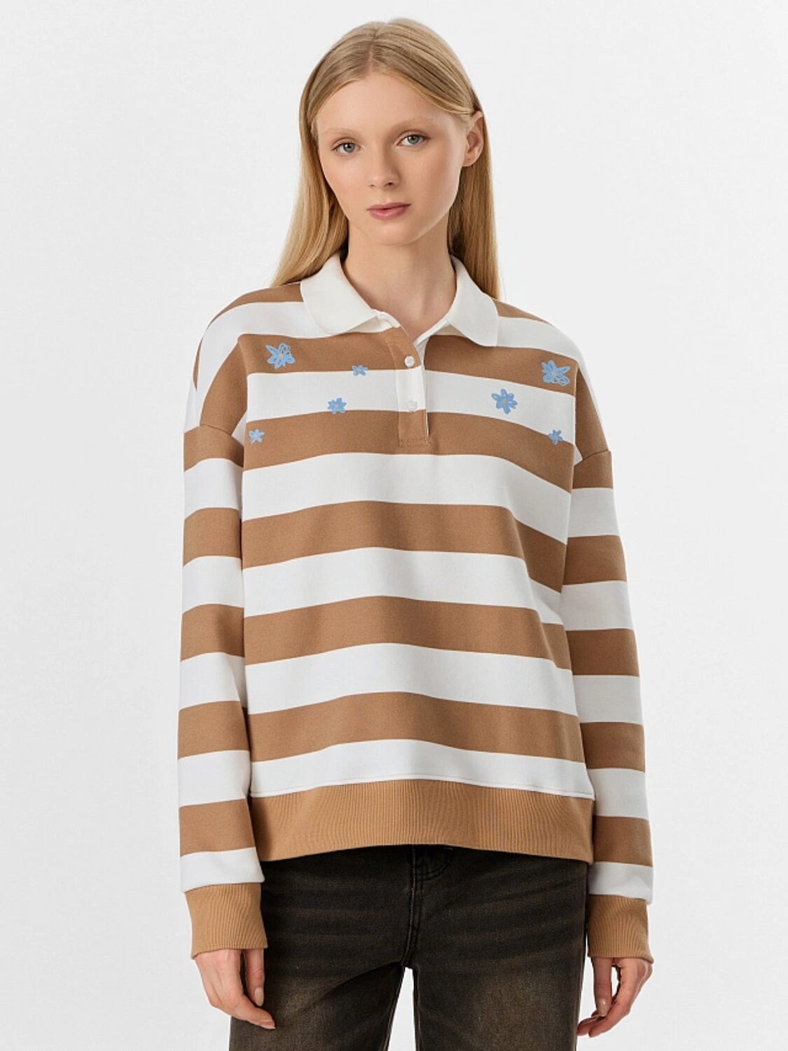 Горловина круглой формы, с отложным воротником из довяза. Спереди центральная застежка с петлями и пуговицами 10мм, обработаная кулирным полотном.