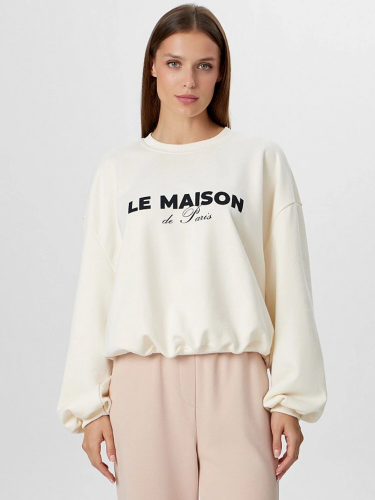 Свитшот свободного силуэта. Горловина круглой формы с обтачкой из рибаны. Рукава втачные, длинные. Плечо спущено, пройма углублена. По низу рукава отрезная манжета из рибаны. По плечу отрезная декоративная деталь. По низу свитшота отрезной пояс из рибаны. Шов втачивания обтачки, рукава, плечевые, шов притачивания пояса распошиты.