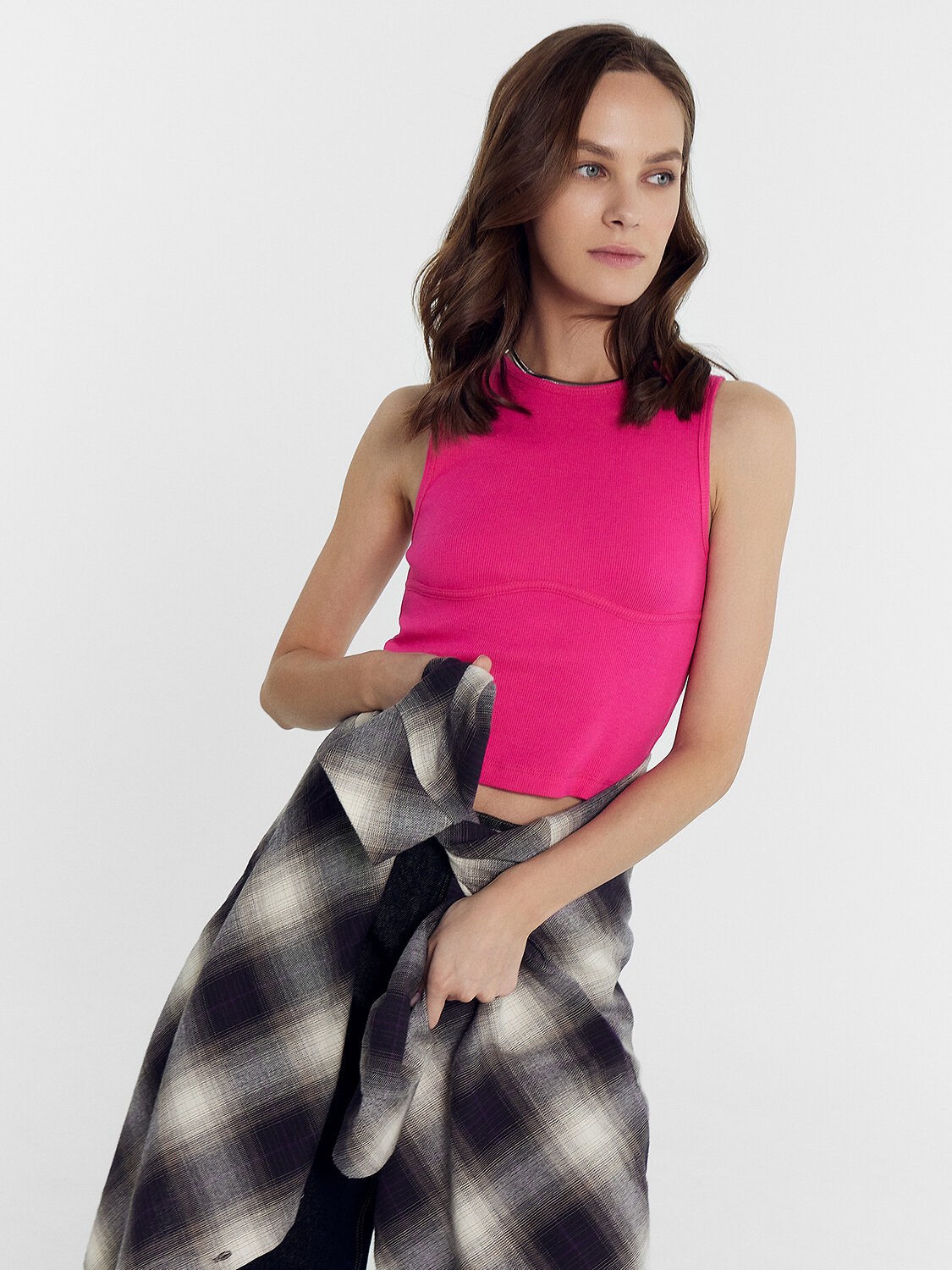 Укороченный женский топ облегающего силуэта. Выполнен из трикотажной рибаны. Горловина круглой формы. Спереди есть фигурный подрез. Стильно и комфортно!