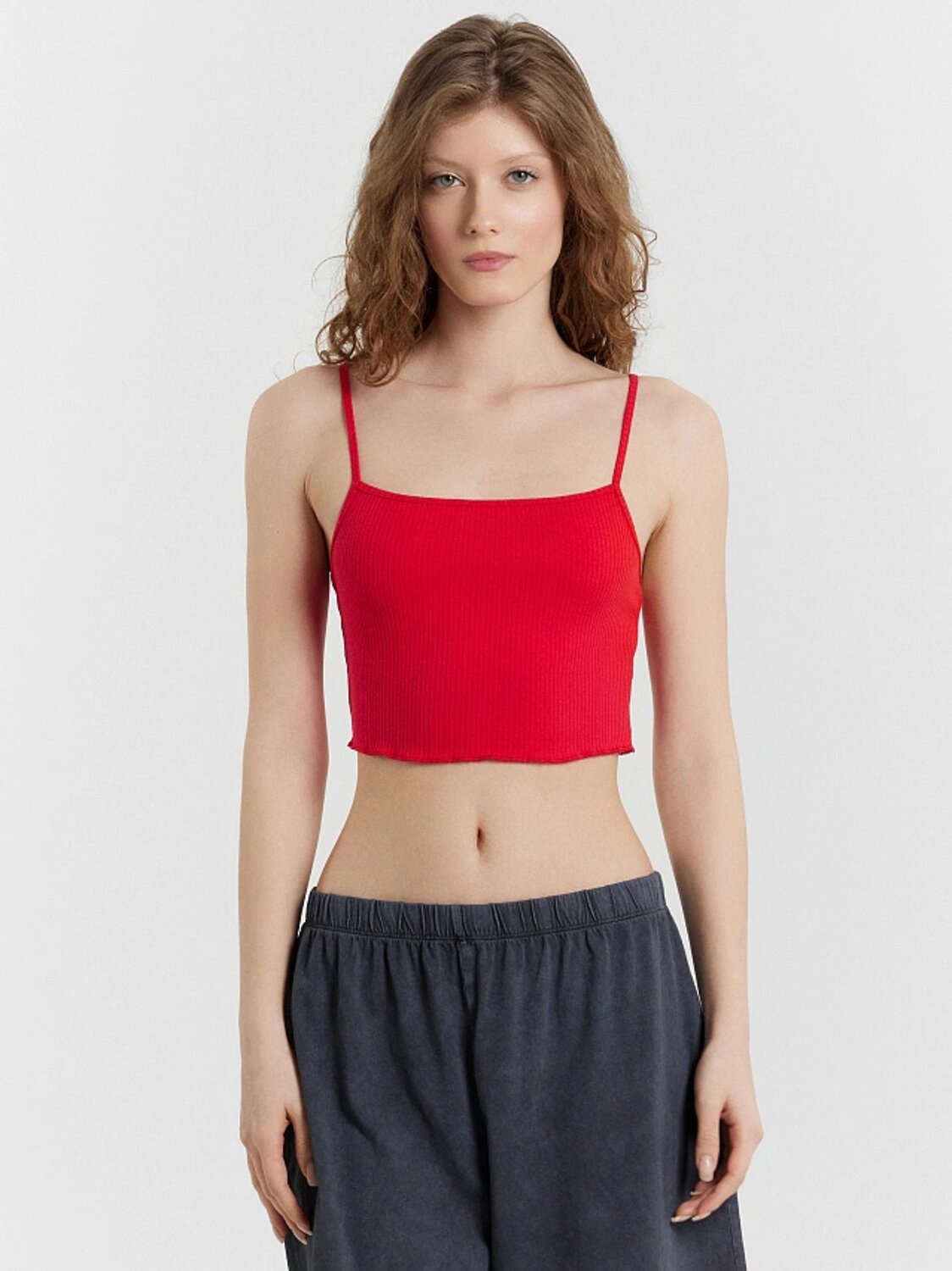 Стильный топ на тонких бретелях — прекрасный вариант для летнего гардероба. Благодаря хлопковой трикотажной рибане в рубчик он мягко прилегает к телу, создавая комфортное ощущение и подчеркивая силуэт. Особенность модели — закрученный нижний срез, который добавляет динамичный акцент и делает дизайн оригинальным. Такой крой придает изделию стильный и непринужденный вид, идеально подходящий для летних образов. Этот топ легко комбинируется с джинсами, юбками, шортами или льняными брюками, позволяя создавать стильные повседневные или вечерние наряды. Легкий, удобный и актуальный — отличный выбор для теплого времени года!