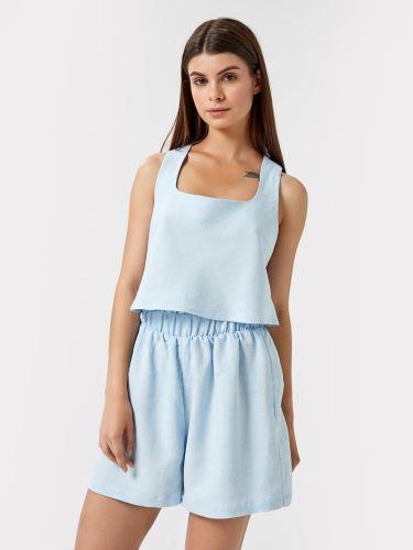 Топ с треугольными чашками, на бретелях. Бретели с втаченой внутрь эластичной тесьмой, присборены. Низ изделия обработан поясом с втаченной эластичной тесьмой.