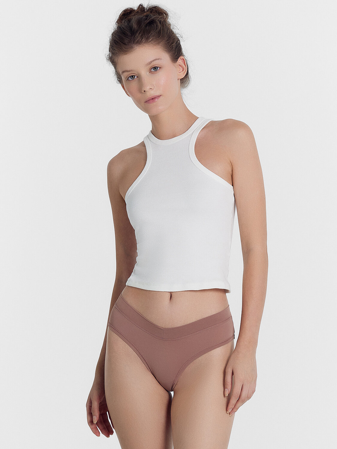 Трусы женские со средней посадкой силуэта «бразилиана» из микрофибры с отрезным поясом. Передняя центральная деталь цельная. Подкладка ластовицы из кулирного полотна отлетная по переднему краю.