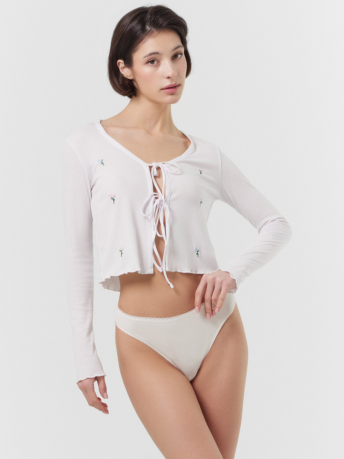 Нижние срезы обработаны эластичной тесьмой 6 мм ( тканая жилка, девсел 13460W) с изнаночной стороны, на плоскошовной двухигольной машине. Верхний край трусов обработан декоративной тесьмой 13мм (DT15-13, девсел 1278K)