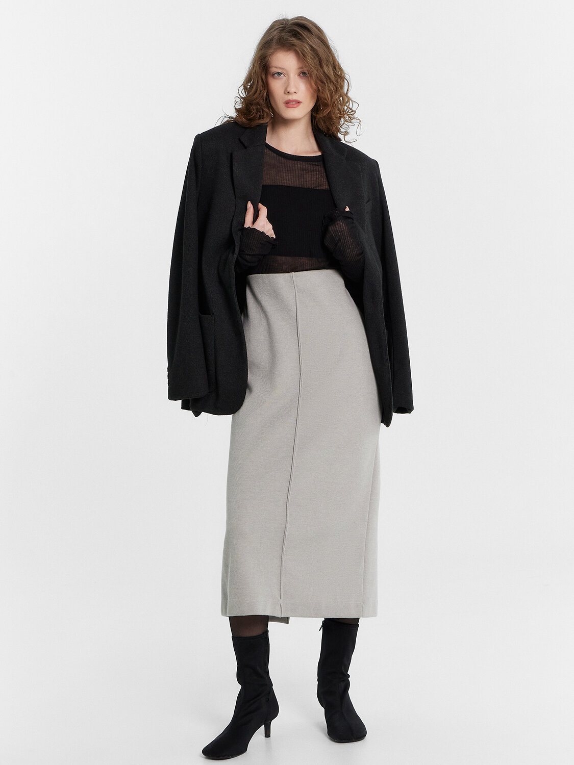 Юбка прямая, длина миди. Верхний срез обработан швом вподгибку с эластичной тесьмой внутри ( 40мм 40RV внутр.). На передней и задней детали проложена строчка по среднему шву. На задней детали в среднем шве обработан разрез. Нижний срез обработан швом вподгибку. Усилитель разреза- Лента репсовая шир.7мм, SFLR-2 .