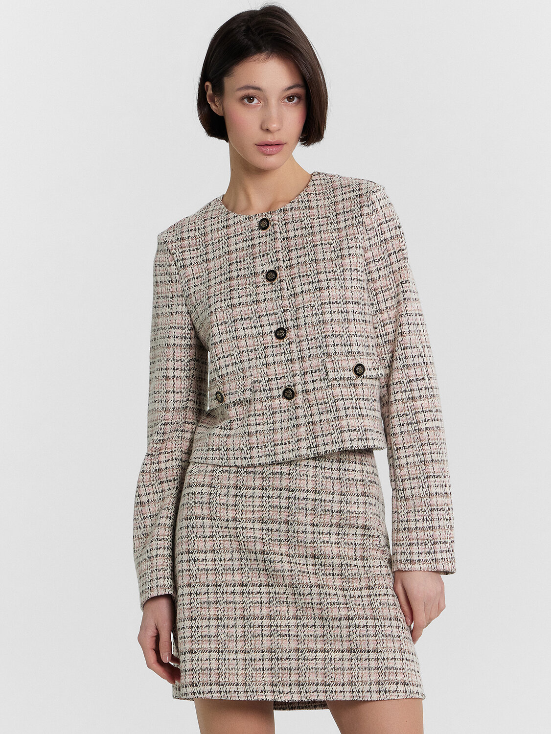 Жакет прямого силуэта, укороченный. Горловина круглой формы, обработана обтачкой из основного полотна. Рукава втачные длинные, двухшовные. Плечо с плечевой накладкой внутри (В-14). Перед с центральной застежкой на петли и пуговицы (пуговицы на ножке D 20-23мм). Борта обработаны подбортами. На детали переда настрочены клапаны с пуговицами. Спинка со средним швом и вертикальными рельефами. Нижние срезы жакета и рукавов обработаны швом вподгибку.