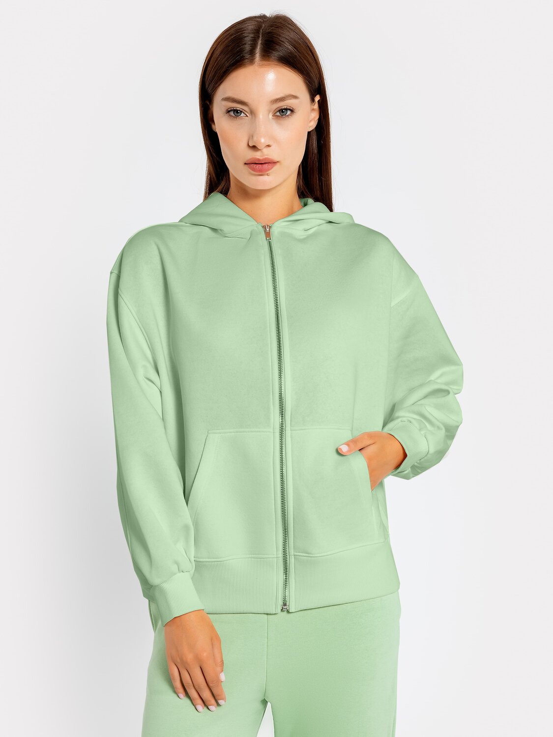 Комфортная и уютная женская толстовка в спортивном стиле. Выполнена из футера с теплым и нежным подчесом. Силуэт свободный – оверсайз, длина до середины бедер. Спущенная линия плеча и углубленная пройма дарит свободу движений. Рукава длинные и свободные, с манжетами. Капюшон просторный, есть удобный карман-кенгуру. Спереди толстовка застегивается на молнию. Рекомендуем!
