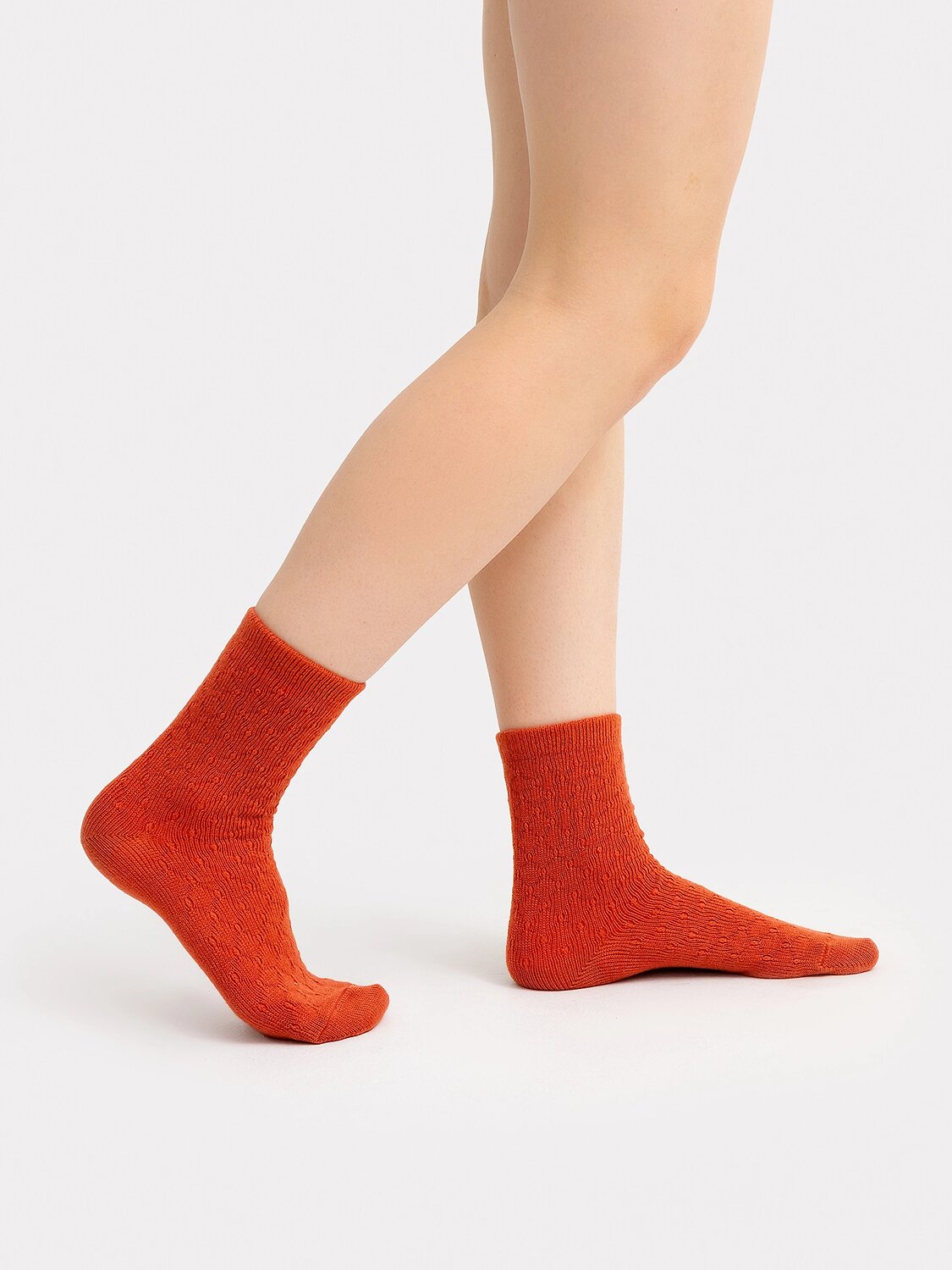 Высокие носки женские шерстяные с текстурой объемных ромбиков. Выполнены из высококачественного гребенного хлопка — тонкого, прочного и эластичного. Натуральные волокна отлично пропускают воздух и впитывают влагу, обеспечивают ощущение комфорта в течение дня. Благодаря небольшому количеству эластана в составе, носочки хорошо облегают и сохраняют форму, практичны и долговечны. Пятка и мысок дополнительно усилены для защиты от протирания при активном движении. Резинка мягко, но надежно удерживает носки, не передавливая ногу и не оставляя на коже следов. Отличный вариант для зимних дней и новогодних праздников. Нежные, достаточно теплые и мягкие, создадут атмосферу тепла и уюта. Порадуйте себя и своих близких прекрасными носочками от Mark Formelle!