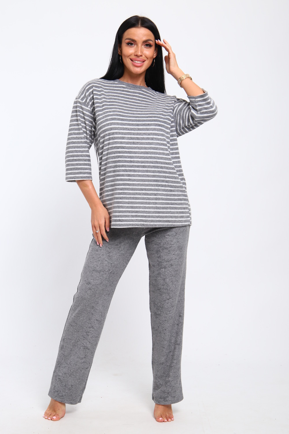 Костюм женский больших размеров, который станет идеальным выбором для уютных вечеров дома и активных дней. Этот домашний махровый костюм, выполненный из высококачественной приятной ткани, надежно согреет вас в холодную погоду. Мягкая махра дарит невероятный комфорт, а свободный крой позволяет чувствовать себя уверенно, независимо от ваших занятий: будь то отдых, прогулка с друзьями или поход в магазин. Стильный зимний костюм включает лонгслив оверсайз в полоску с округлым вырезом и брюки, создавая гармоничный и универсальный наряд. Широкая размерная сетка, начиная от 58 до 70, делает этот комплект доступным для девушек и женщин любого размера. А оригинальный принт полоска и базовый свитшот, легко комбинирующийся с другими вещами, добавляют вашему образу модный акцент. Махровый костюм легко заменит ночную пижаму зимой. Не переживайте за внешний вид: костюм сохранит свою форму даже после многократных стирок, а дышащая ткань предотвращает перегрев. Этот комплект двойка отлично подходит как для беременных и кормящих женщин, так и для занятий спортом, ведь он свободно облегает фигуру и не сковывает движений. Костюм женский теплый украсит вас на пижамной вечеринке или семейной фотосессии. Пижама махровая в полоску - милый подарок для жены или дочери на Новый год или 8 марта. Подарите себе или своим близким этот уютный костюм, который обеспечит комфорт в любое время года весной, летом, осенью и зимой. Будьте стильными и уверенными в своих нарядах в каждой ситуации!