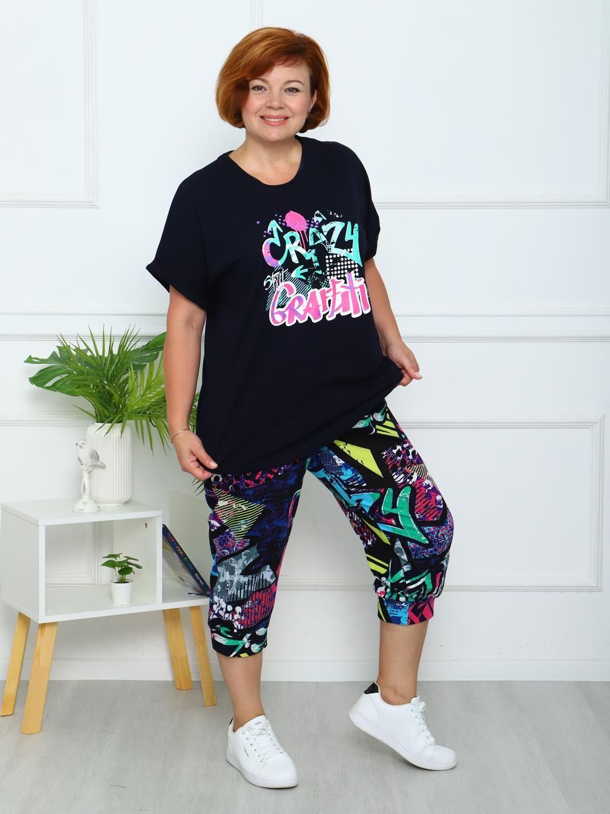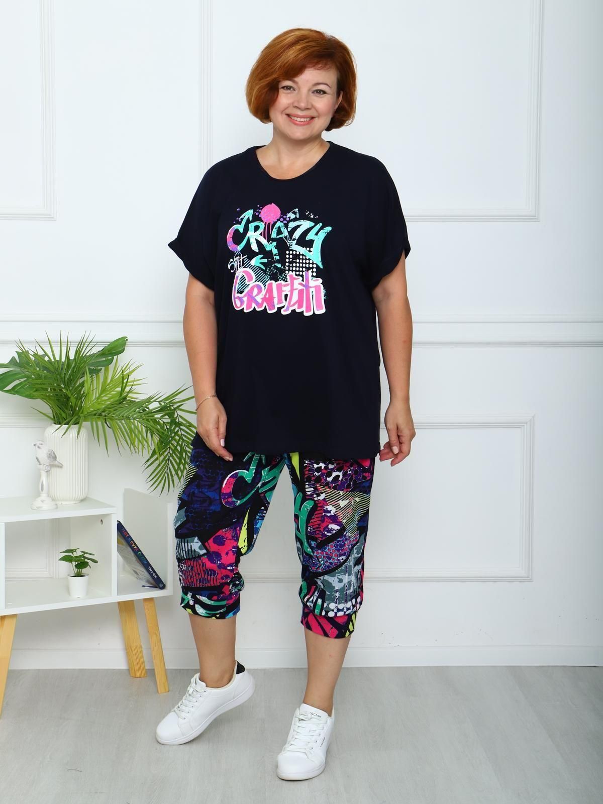 Женский домашний костюм из трикотажного полотна. Футболка свободного силуэта, спущенный рукав отделан манжетом. Бриджи длиной ниже колена на манжете.