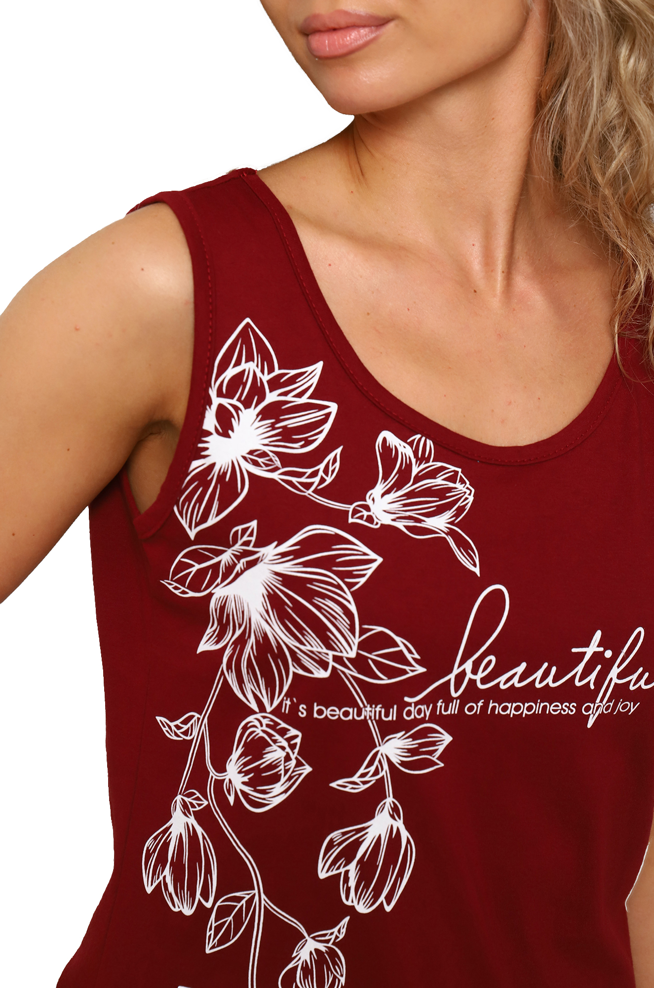 Самая удобная и комфортная летняя вещь в гардеробе - это хлопковая майка. Модель прямого классического кроя на широкой бретели, на полочке эффектный печатный принт.