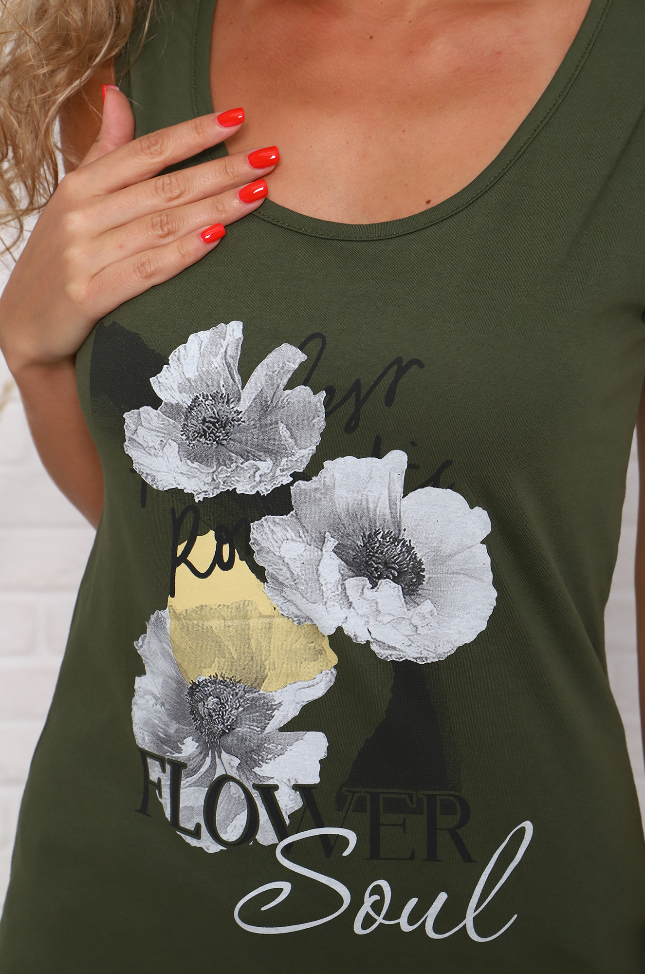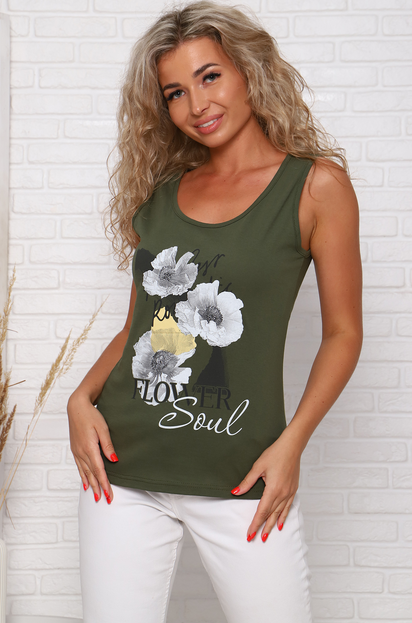 Самая удобная и комфортная летняя вещь в гардеробе - это хлопковая майка. Модель прямого классического кроя на широкой бретели, на полочке эффектный печатный принт.