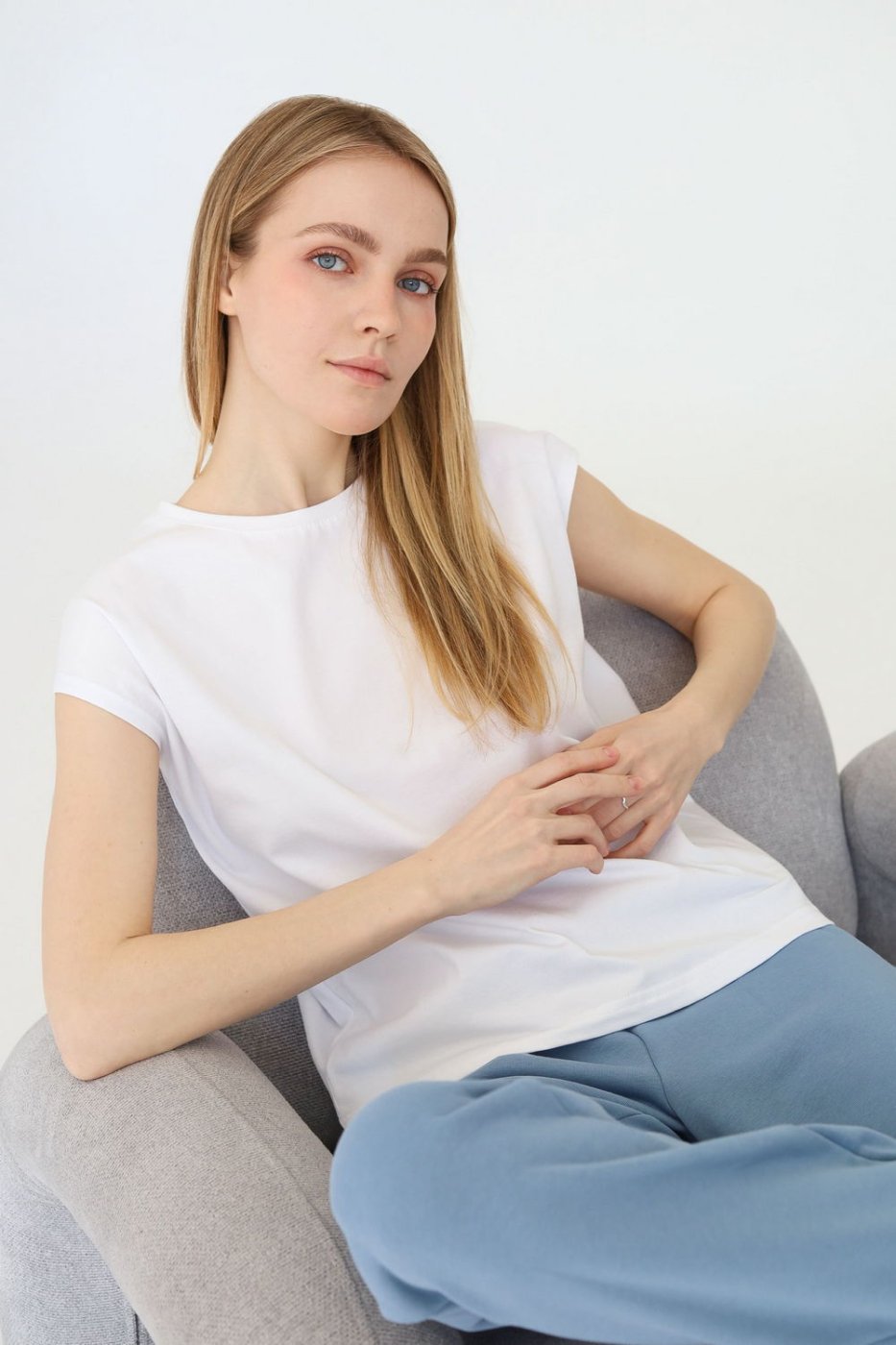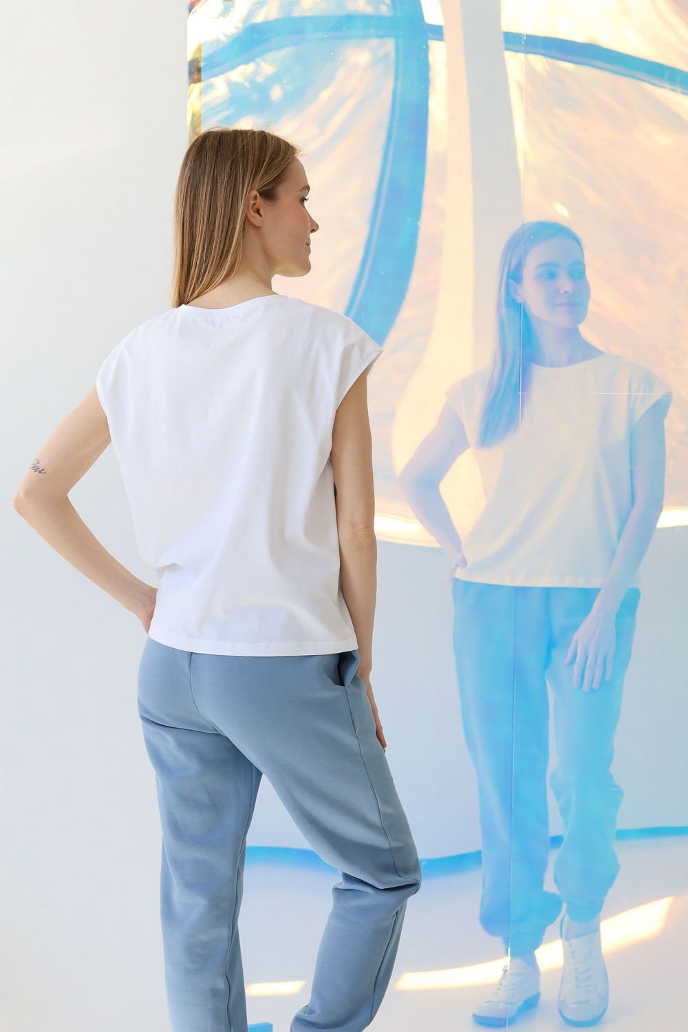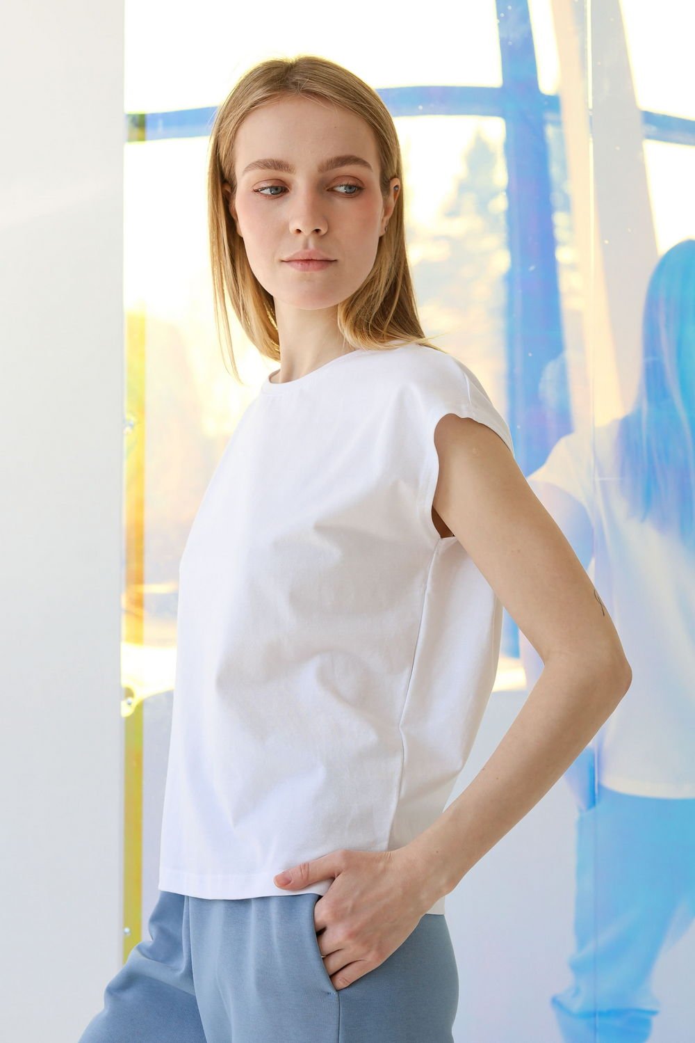 Футболка без рукавов, свободного, слегка зауженного к низу силуэта