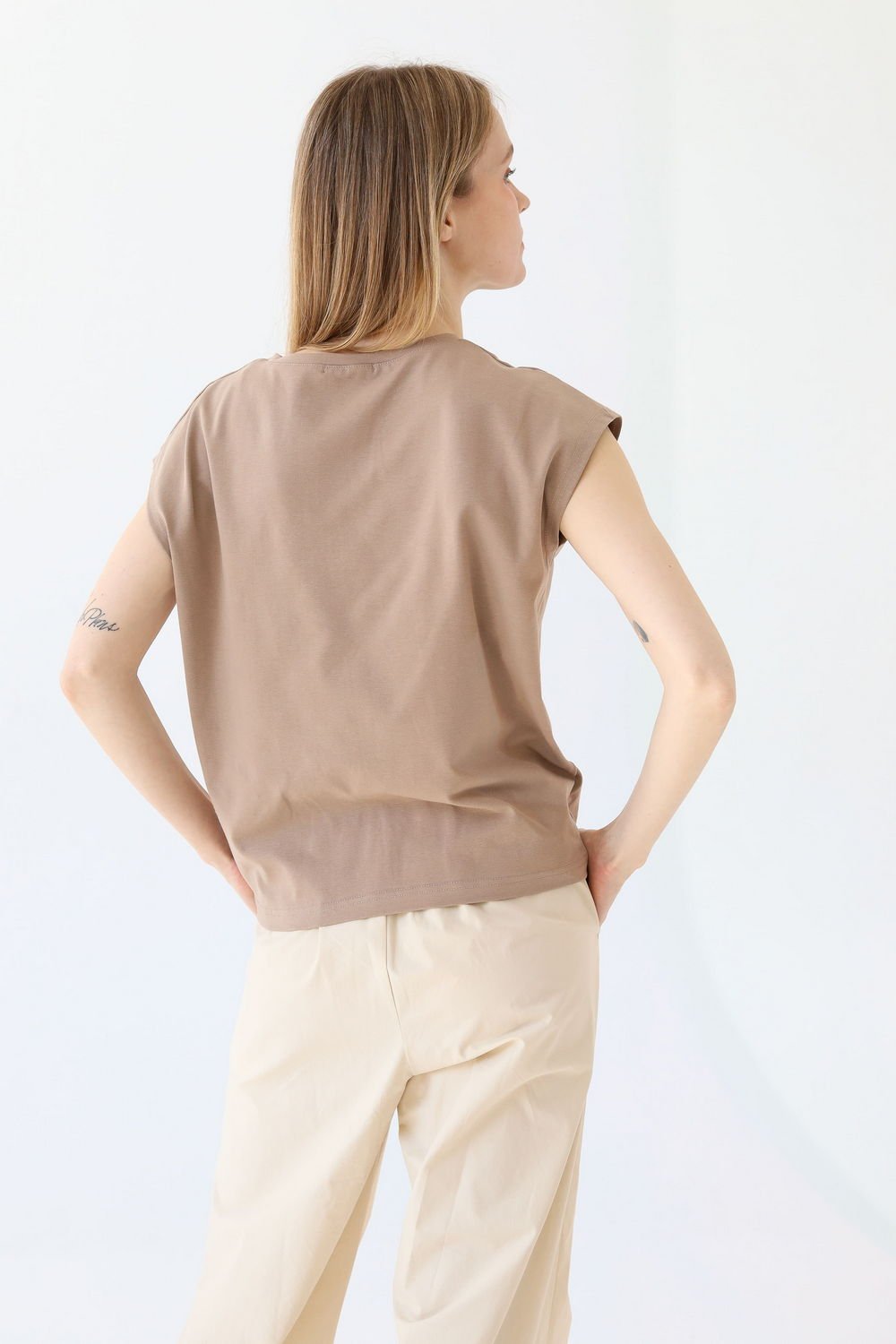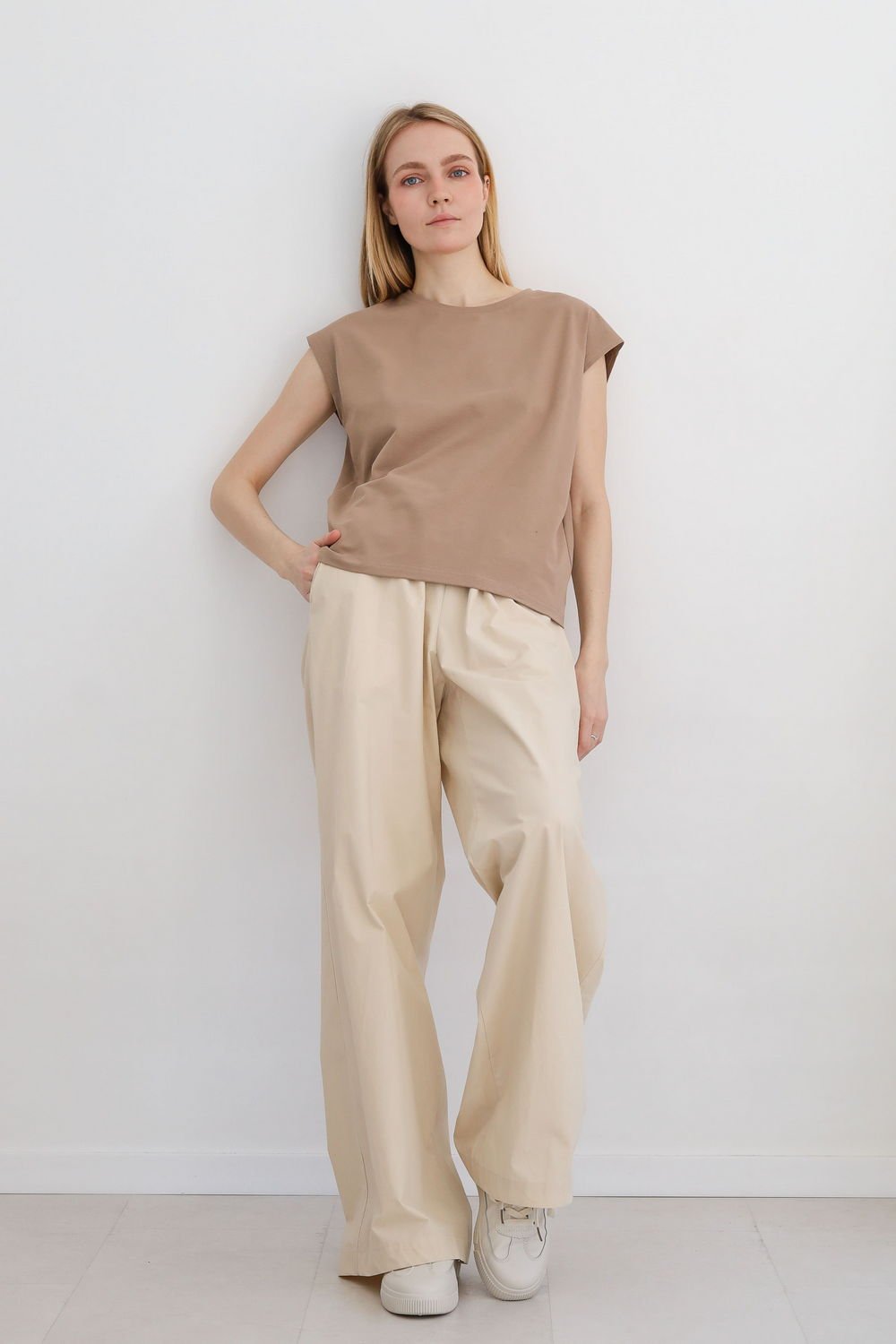 Футболка без рукавов, свободного, слегка зауженного к низу силуэта