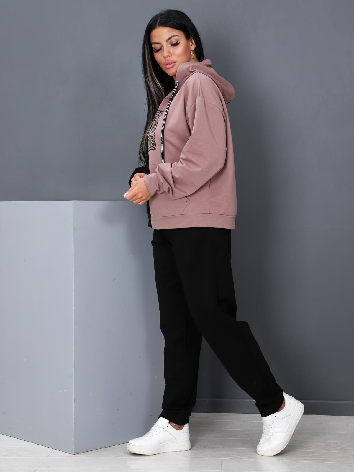 Женский трикотажный костюм состоит из кофты и брюк.Кофта свободного силуэта, комбинированная из двух цветов ткани. Капюшон на люверсах с декоративным шнуром . Рукав на манжете. Брюки с карманами в боковых швах, верх на поясе с эластичной простроченной тесьмой.