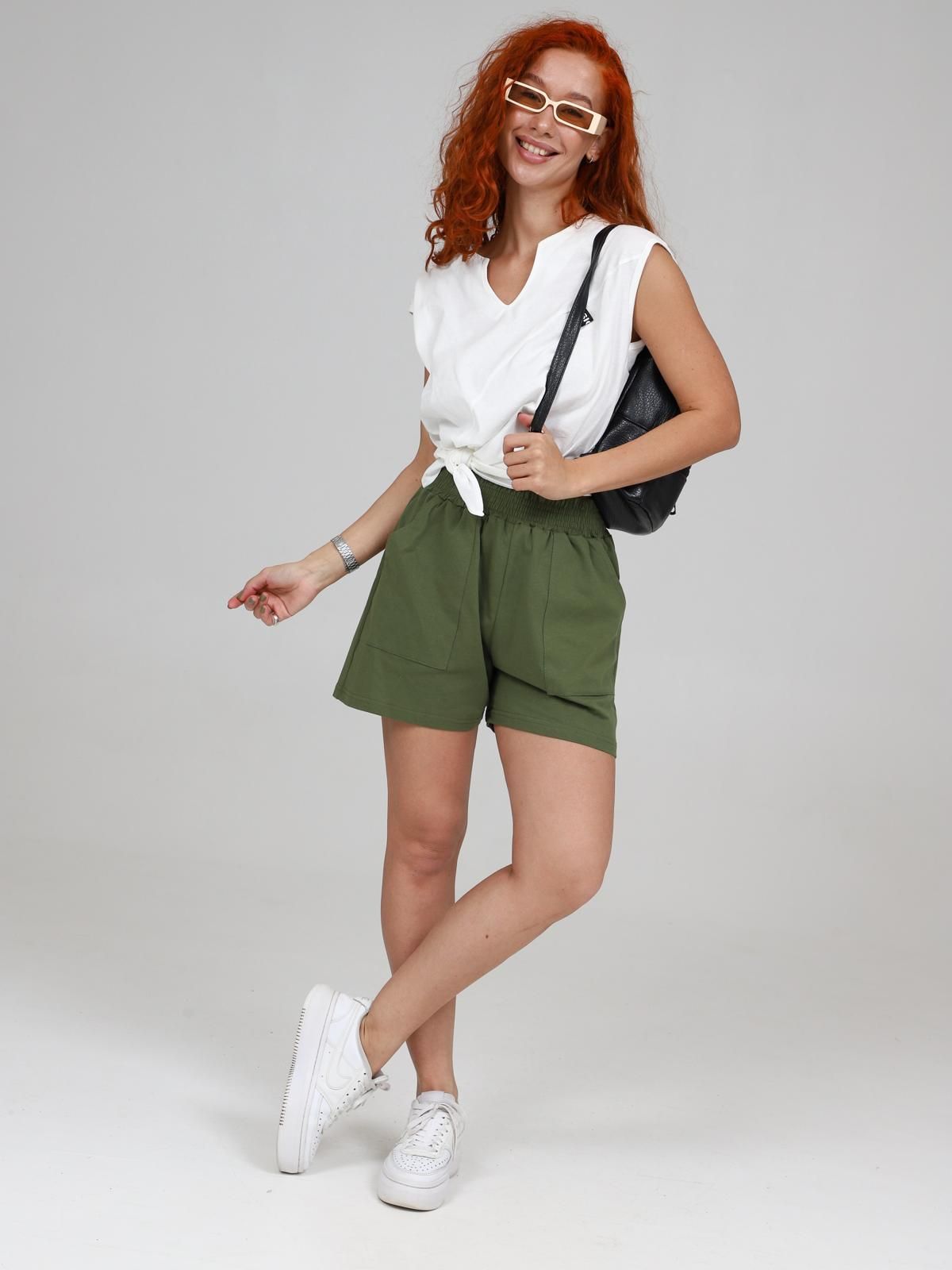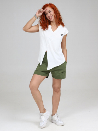Костюм состоит из шорт и блузы. Шорты удлиненные, свободного покроя с накладными карманами и широкой резинкой по верху. Блуза выполнена в ассиметричном стиле, есть возможность низ завязывать узелком. Рукав блузы слегка спущенный, что придает изделию легкость и свободу движениям.