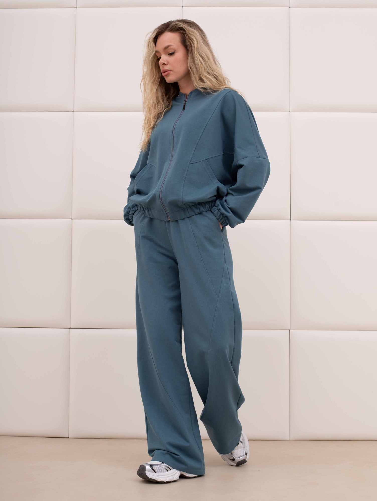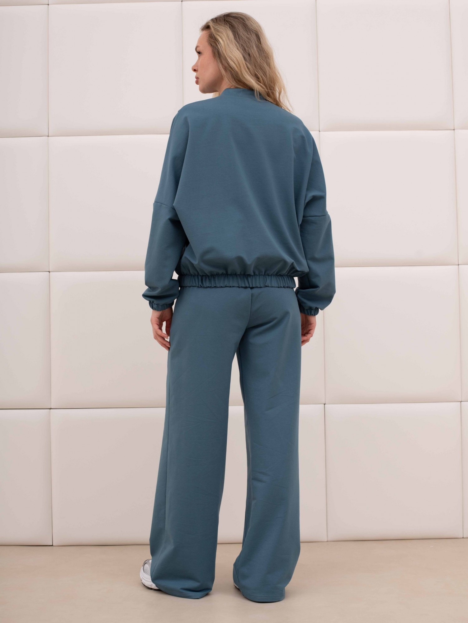 Куртка – бомбер молодежная из гладкокрашенного трикотажного полотна «футер» прямого силуэта, свободная, со спущенной линией плеча, длинными втачными рукавами и накладными карманами. Горловина овальной формы, обработана втачной планкой. Центральная бортовая застежка на тесьму «молния». Полочка состоит из трех деталей, две из которых скроены по косой, с отделочными строчками по шву стачивания. Низ изделия и нижние срезы рукавов обработаны подгибкой с эластичной тесьмой внутри.