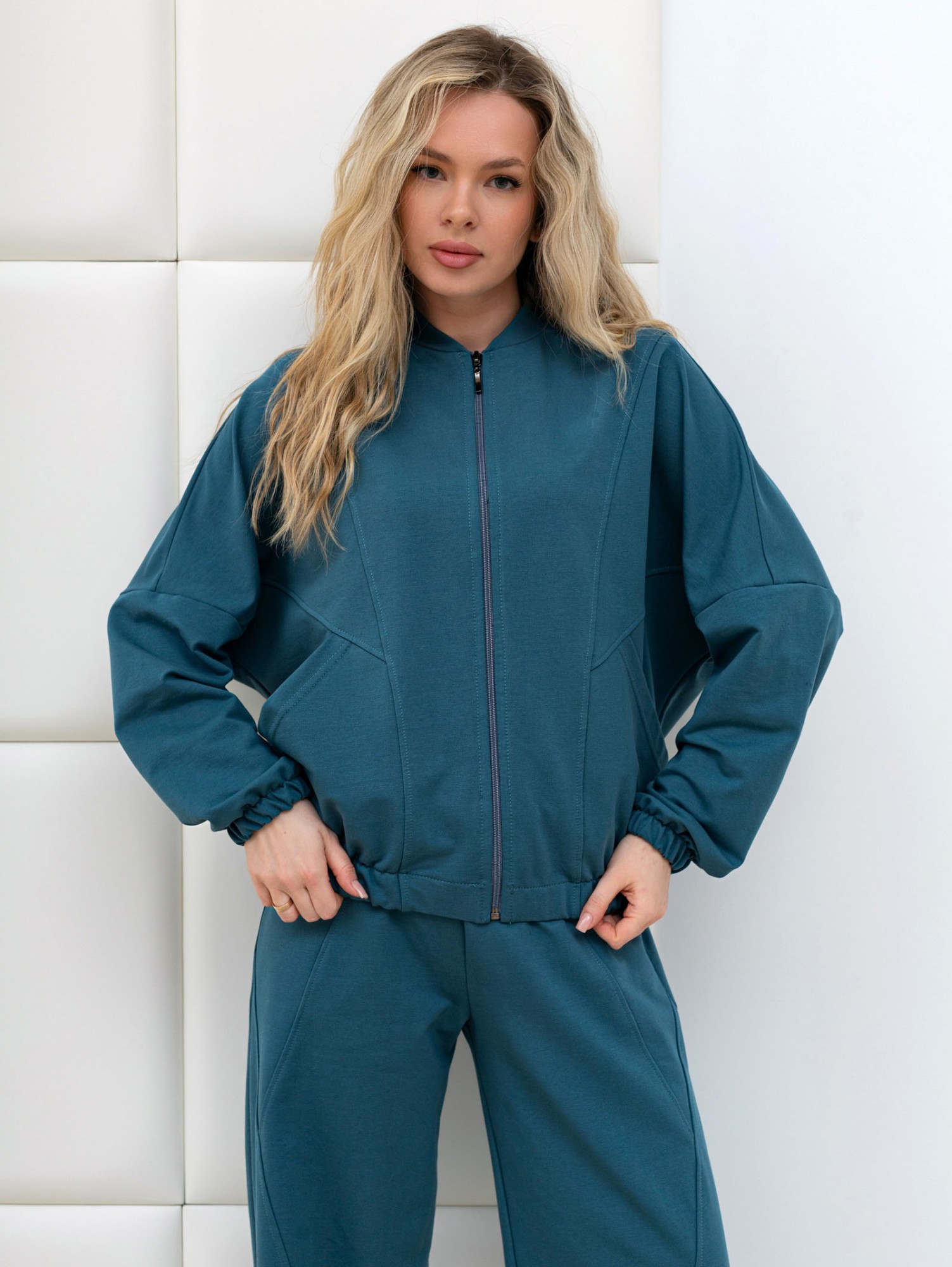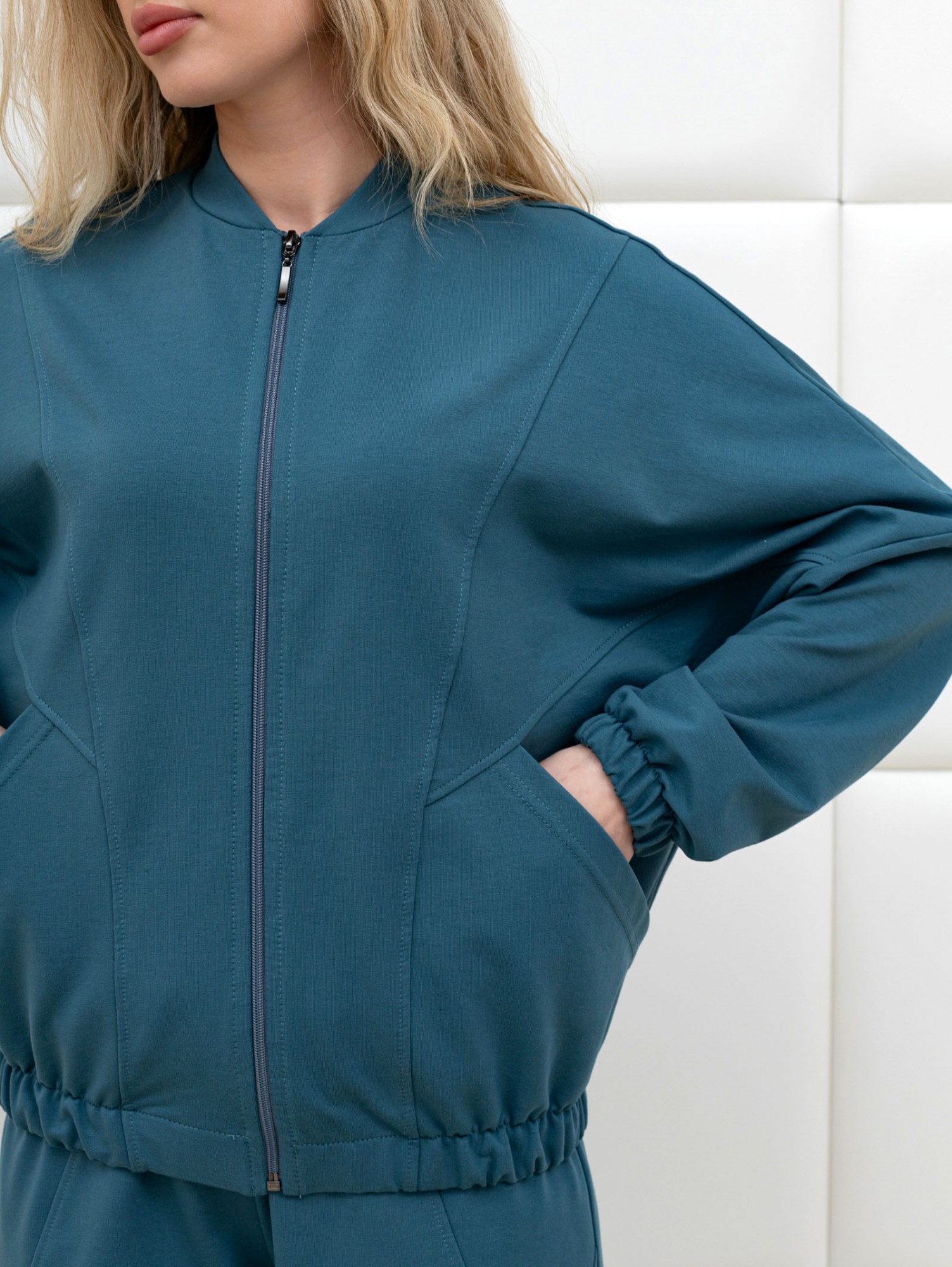 Куртка – бомбер молодежная из гладкокрашенного трикотажного полотна «футер» прямого силуэта, свободная, со спущенной линией плеча, длинными втачными рукавами и накладными карманами. Горловина овальной формы, обработана втачной планкой. Центральная бортовая застежка на тесьму «молния». Полочка состоит из трех деталей, две из которых скроены по косой, с отделочными строчками по шву стачивания. Низ изделия и нижние срезы рукавов обработаны подгибкой с эластичной тесьмой внутри.