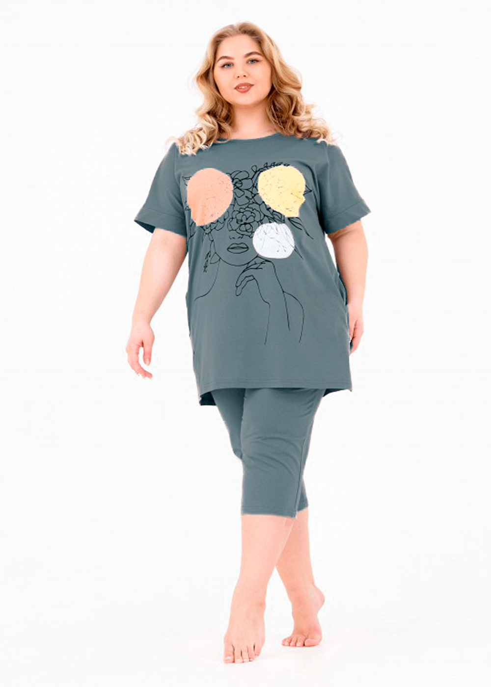 Хлопковый костюм с бриджами от бренда MODALINA состоит из: туники полуприлегающего силуэта с коротким рукавом и прорезными карманами, длина футболки - ниже бедер, горловина округлой формы, с ненавязчивым принтом. Бриджи классической длины с прорезными карманами, с широкой резинкой, которая не передавливает животик.