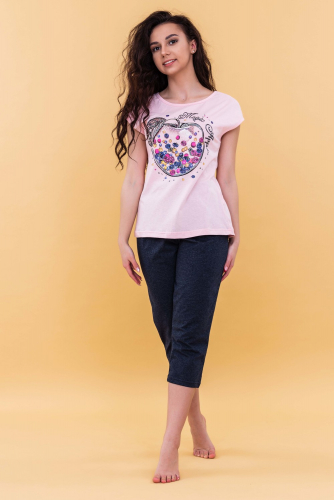 Хлопковый костюм с бриджами от бренда MODALINA состоит из: туники полуприлегающего силуэта с коротким рукавом и прорезными карманами, длина футболки - ниже бедер, горловина округлой формы, с ненавязчивым принтом. Бриджи классической длины с прорезными карманами, с широкой резинкой, которая не передавливает животик.