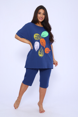 Домашний костюм женский изготовлен из ткани кулирка - мягкого и гладкого трикотажного полотна из хлопка. Костюм женский для дома и отдыха состоит из удлиненной футболки и бридж. Футболка прямого кроя, горловина круглая, обработана окантовкой, по бокам карманы. Рукав короткий. На полочке выполнен принт. За счет свободного кроя, брюки очень удобны и комфортны в эксплуатации. Состав: 100% хлопок.