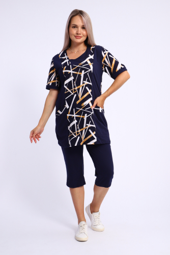 Костюм включает в себя стильную футболку и бриджи, выполненные из высококачественного материала, который гарантирует отличную воздухопроницаемость и приятные тактильные ощущения. Будьте уверены, что в этом комплекте вам будет удобно и тепло в любое время года. Он отлично сидит на фигуре и подчеркивает её достоинства, что особенно актуально для подходящей одежды больших размеров. Пижама с бриджами обеспечивает свободу движений, позволяя вам заниматься йогой, фитнесом или просто расслабляться на диване. Спортивный стиль костюма в сочетании с модными элементами поможет вам выглядеть стильно и современно даже в домашней обстановке. Футболка имеет удобный крой и не стесняет движений, что делает её отличным выбором для активного отдыха.