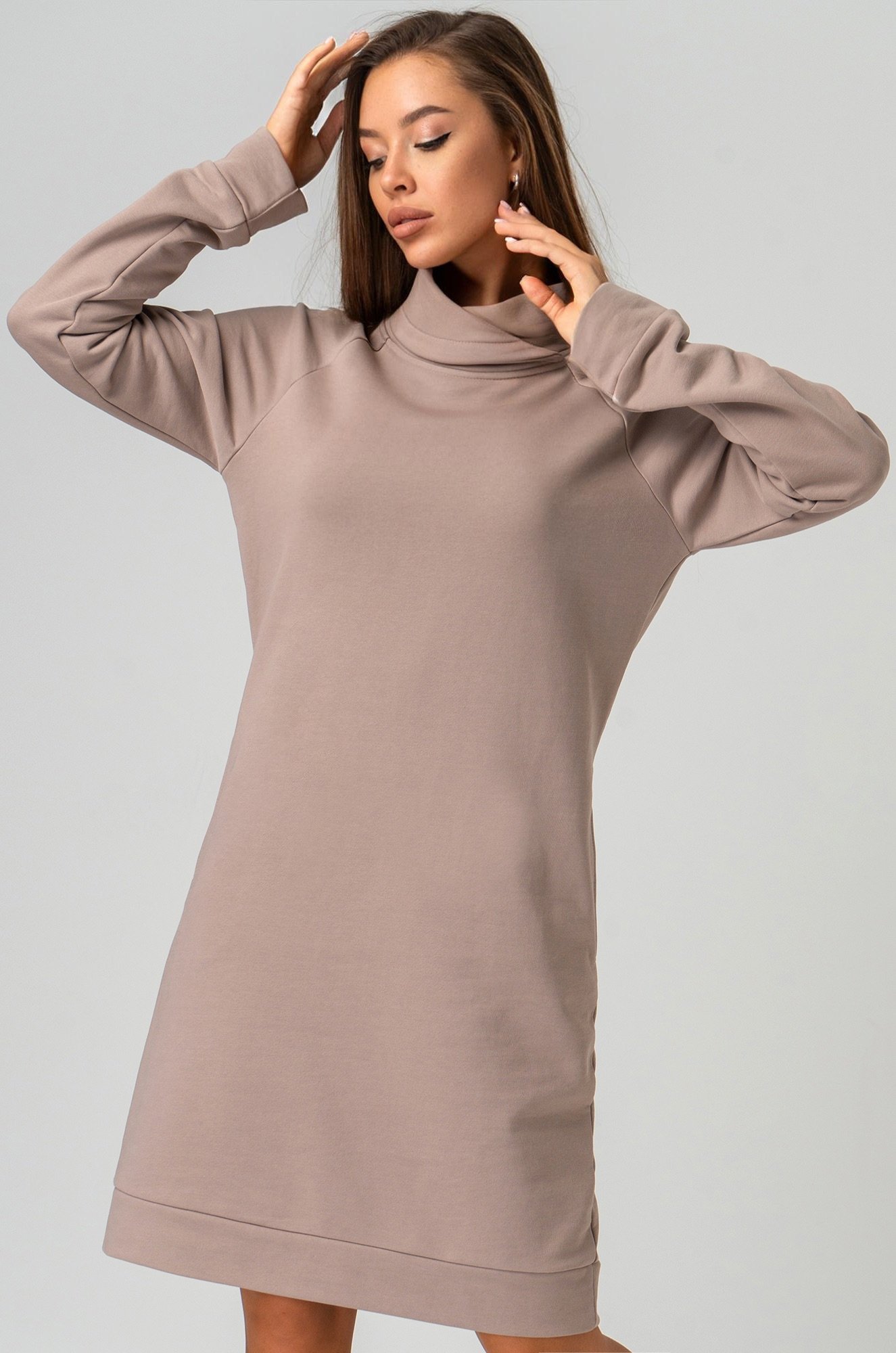 Прямой крой и длина мини создают непринужденный силуэт, позволяя двигаться свободно. Ворот и длинные рукава подчеркивают спортивный стиль, а коричневый цвет делает однотонное платье универсальным. Оно подойдет для прохладных осенних и зимних дней.