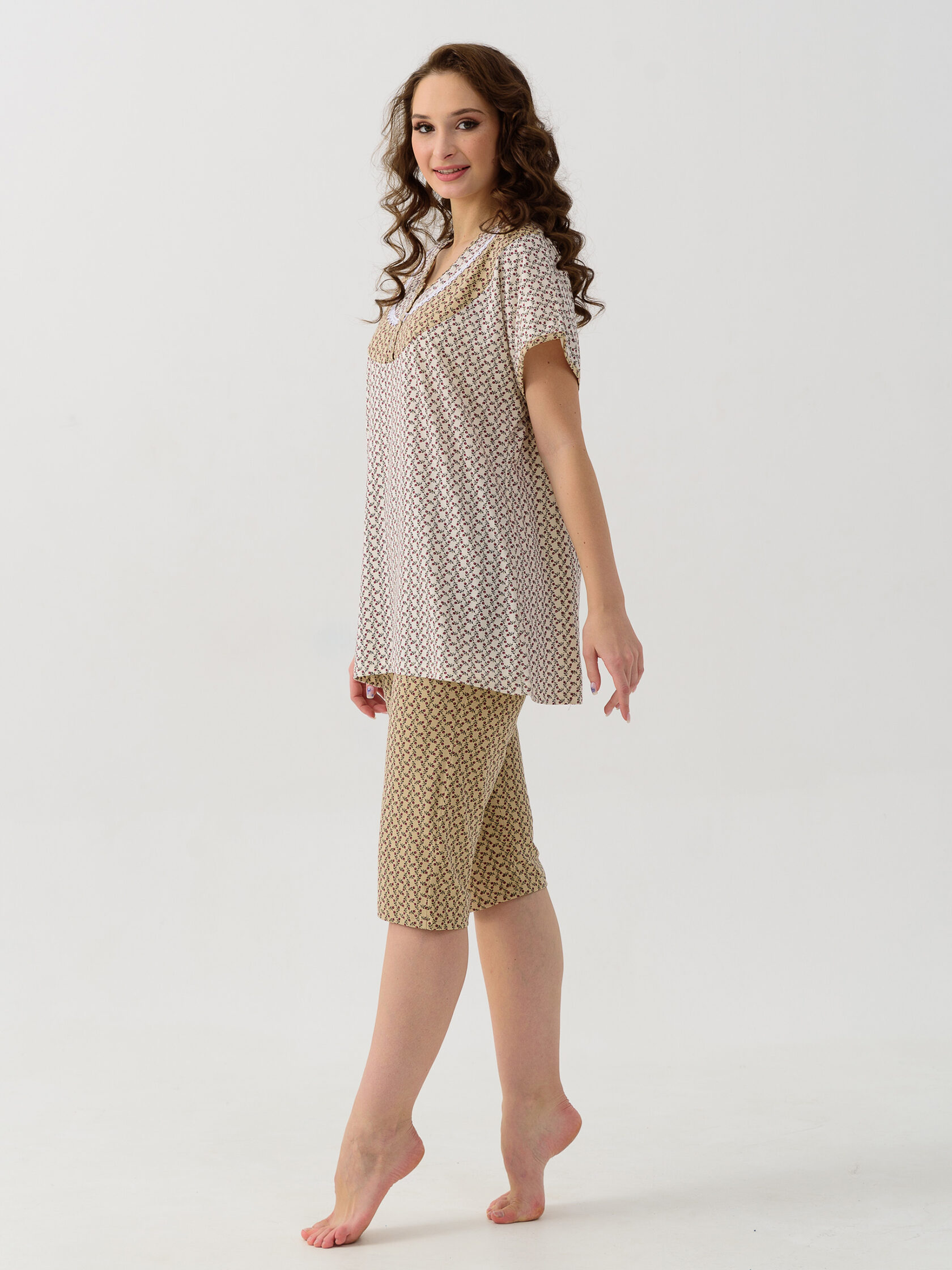 Пижама женская состоит из футболки и бридж. Футболка с круглым вырезом горловины и цельнокроеным рукавом. На полочке фигурная кокетка из отделочного материала отделанная кружевом, на планках с застежкой на кнопки. Горловина и низ рукавов окантованы отделочным материалом. Бриджи прямые из набивного полотна, верх на резинке, низ окантован отделочным материалом. Машинная стирка.