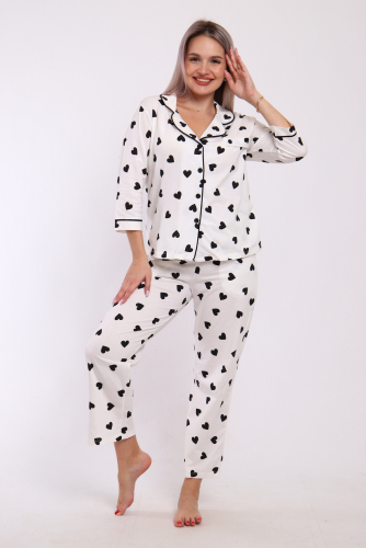 Пижама женская с брюками. Рубашка прямого, свободного кроя на пуговицах с имитацией кармана на груди. Воротник фигурный. Кроя полочки, рукав и воротник обработан внутренней окантовкой. Брюки с карманами, длина по щиколотку.