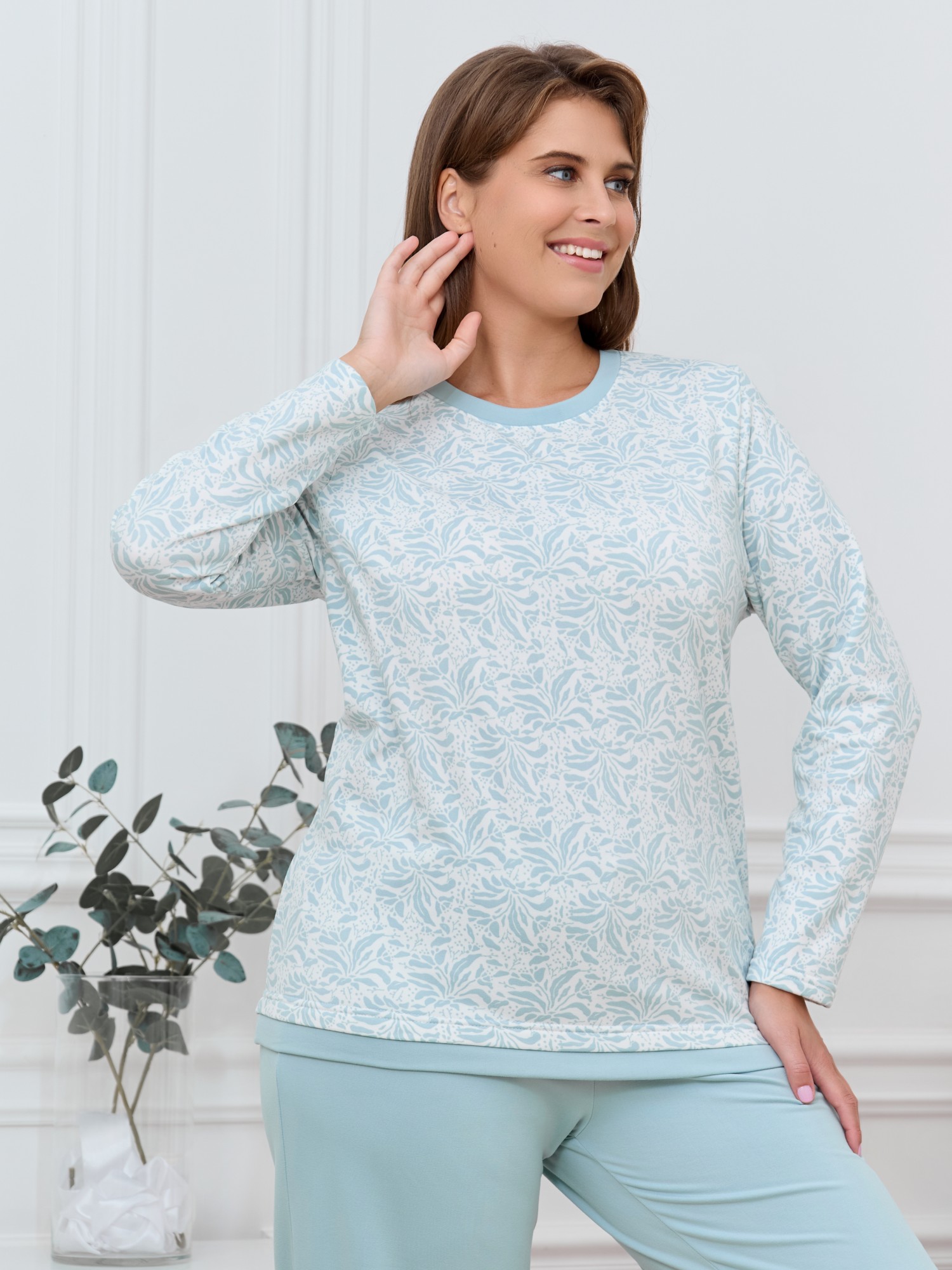Пижама женская из трикотажного полотна «микрофлис» в комбинации двух видов:с набивным рисунком и гладкокрашеного в единой цветовой гамме, состоящая из футболки и брюк. Футболка - из полотна с набивным рисунком, классического покроя, с длинными втачными рукавами, горловиной овальной формы, обработанной втачной планкой. Низ изделия, горловина обработаны притачными планками из контрастного материала.Брюки – свободного покроя, с эластичной тесьмой по талии и нижним срезам.