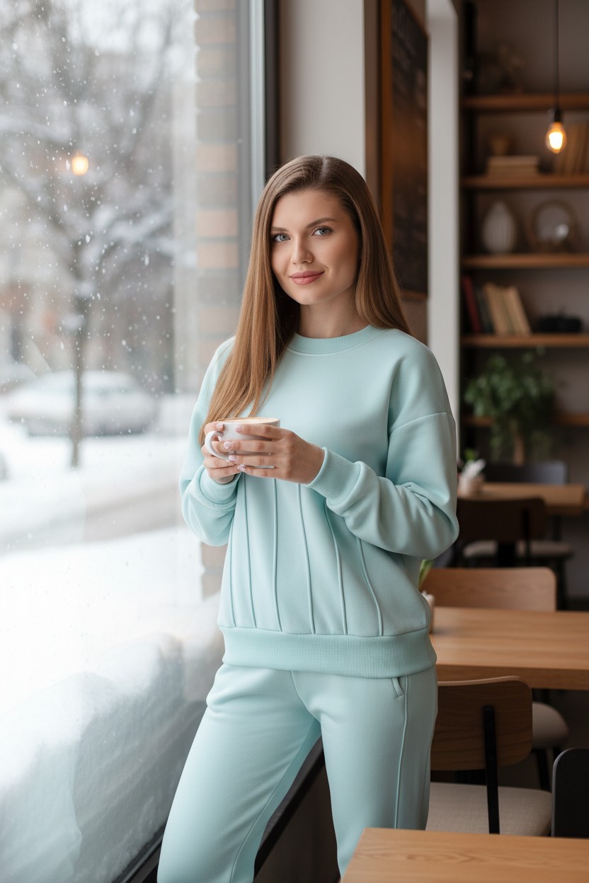 Костюм молодежный из гладкокрашеного трикотажного полотна «футер-интерсофт», состоящий из джемпера и брюк Джемпер – свободного покроя, с длинными втачными рукавами, горловиной овальной формы, обработанной втачной планкой и притачным поясом по низу. Рукава – с притачными манжетами. Манжеты, планка горловины и пояс выполнены из полотна «кашкорсе» такого же цвета, как и основной материал. На полочке застрочены декоративные складочки-защипы, расположенные симметрично относительно линии центра. Брюки – длинные, на притачном поясе с эластичной тесьмой внутри и манжетами по низу. Передние половины – из двух частей каждая, со смещением соединтельных швов в сторону боковых срезов. Соединительные швы передних половин обработаны с карманами. Пояс и манжеты выполнены из трикотажного полотна «кашкорсе».