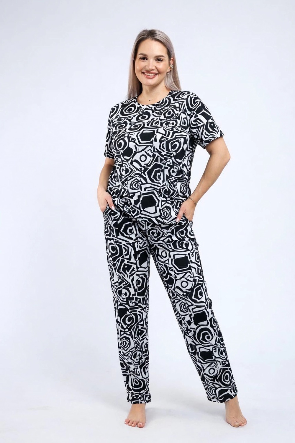Предлагаются стильные и удобные пижамы из высококачественного материала натуральной кулирки 100% хлопка. Ткань отличается мягкостью, приятна к телу и обладает отличной воздухопроницаемостью, обеспечивая комфорт даже в теплую погоду. Благодаря натуральному составу материал абсолютно гипоаллергенен и безопасен для кожи любого типа. Изделия отличаются долговечностью и устойчивостью окраски, сохраняя свежий вид длительное время. Эти пижамы подарят идеальное сочетание стиля, удобства и здоровья, делая отдых приятным и расслабляющим. Цвет: абстрактные розы;черно-белые портреты; Материал: кулирка;кулирка; Состав: 100% хлопок.