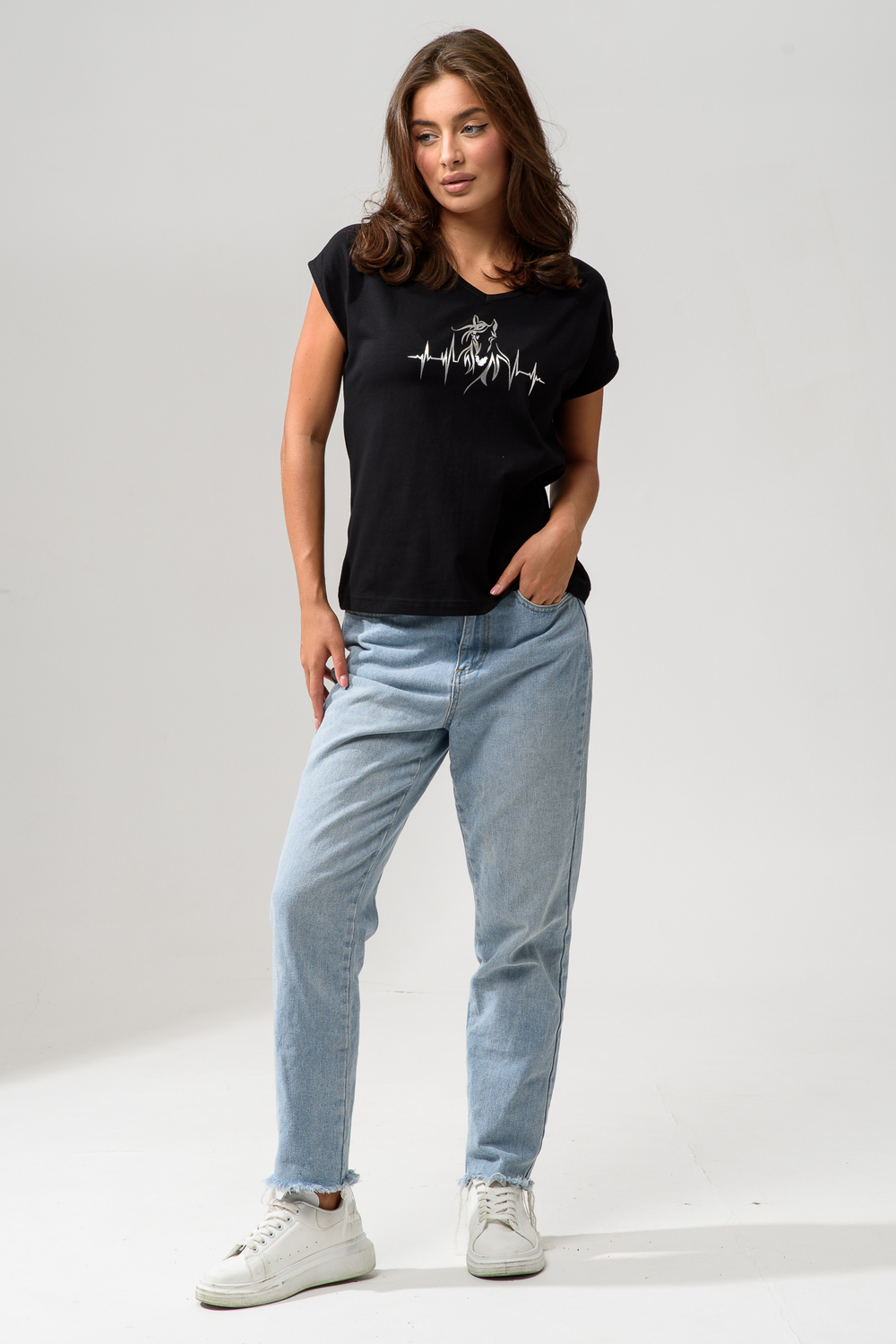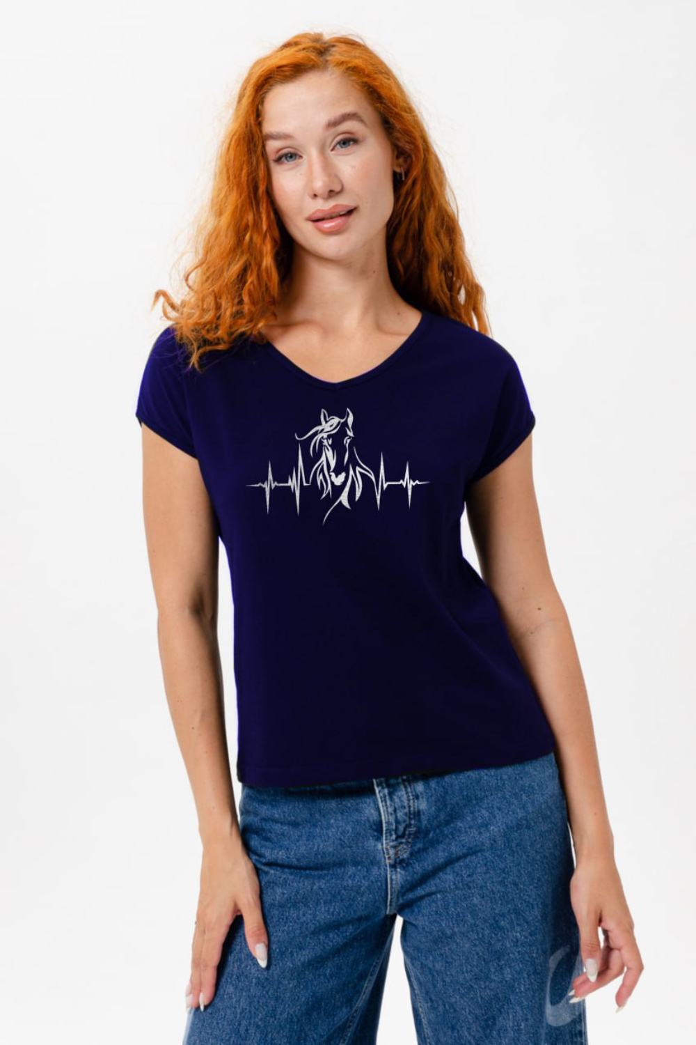 Футболка полуприлегающего силуэта, средней длины, с V-образной горловиной. Рукав цельнокроеный, короткий. Горловина и пройма обработаны бейкой из основного полотна. Цвет: белый+лошадь сердце;черный+лошадь пульс;темно-синий+лошадь пульс; Материал: кулирка;кулирка; Состав: 100% хлопок.