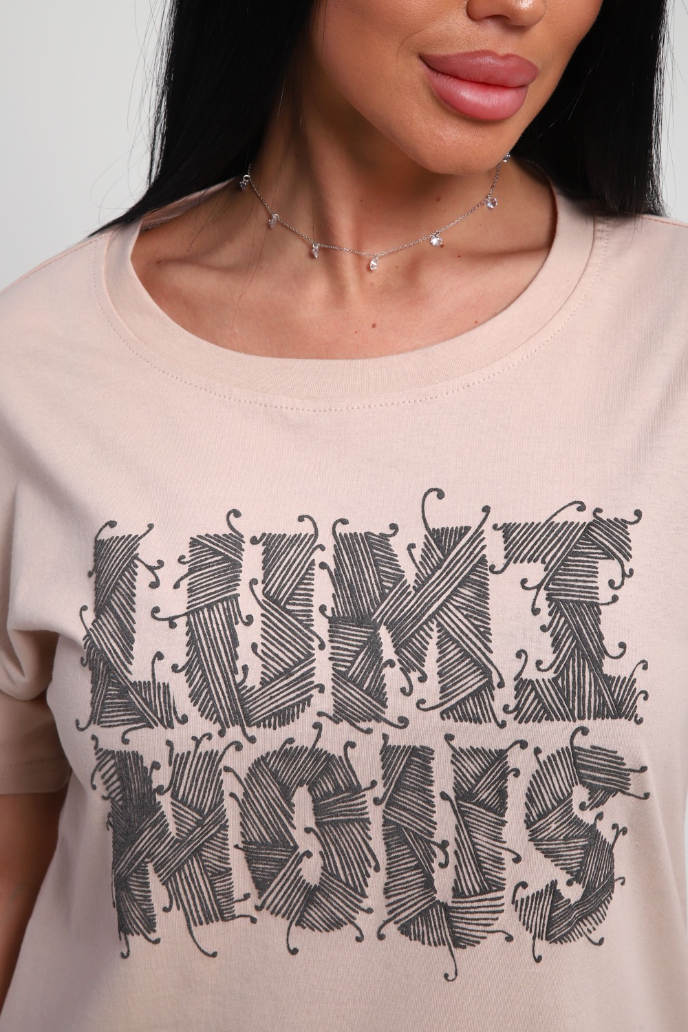 Футболка женская из гладкокрашенного трикотажа, хлопок 100%. Прямого силуэта, свободного облегания. горловина круглой формы. Рукав короткий. Низ изделия прямой. На полочке объемный принт, шелкография. Цвет: бежевый; Материал: кулирка;кулирка; Состав: Хлопок 100%.