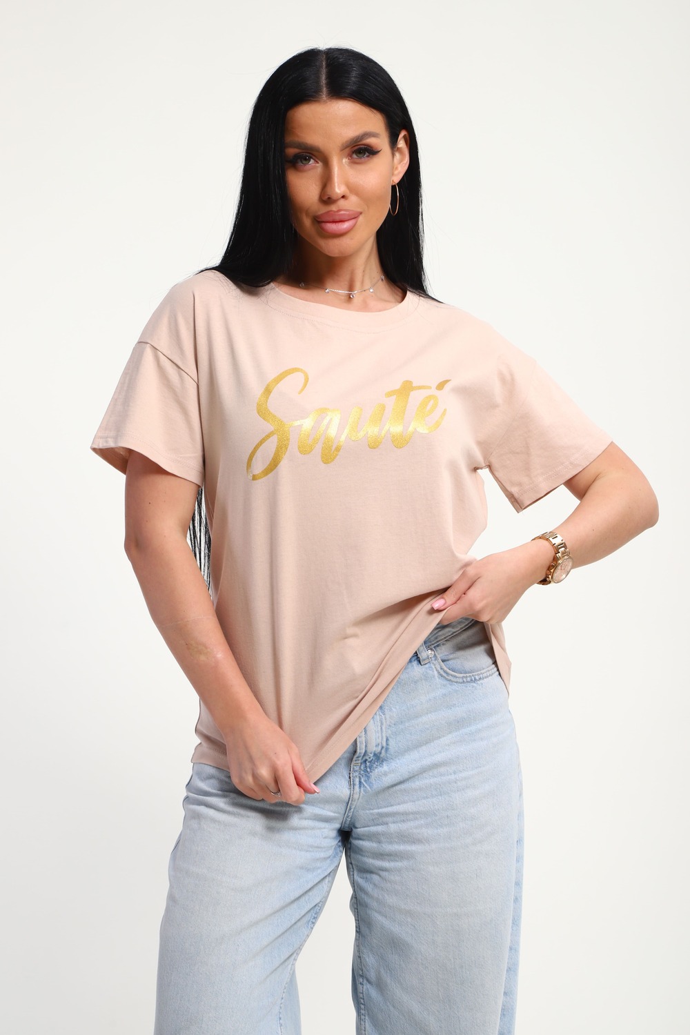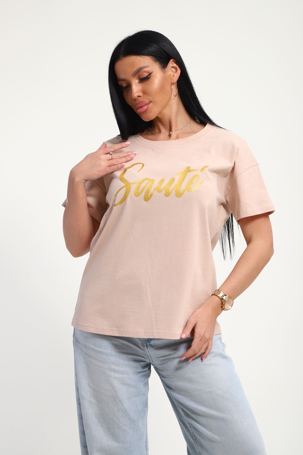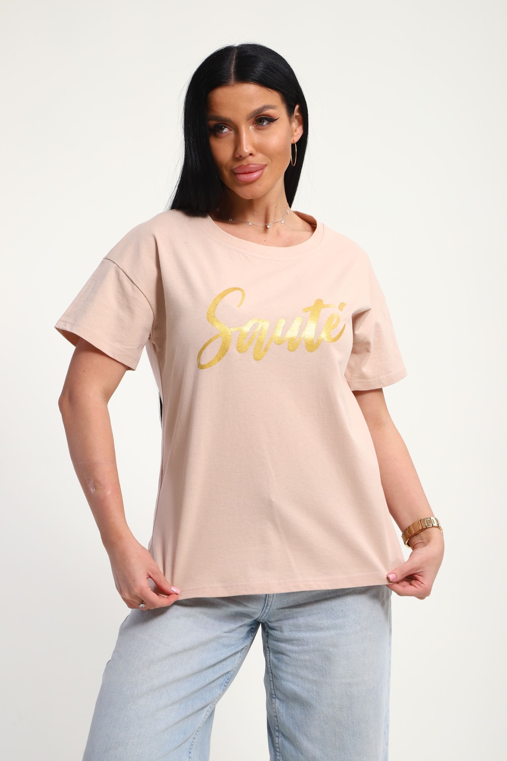 Футболка женская из гладкокрашенного трикотажа, хлопок 100%. Прямого силуэта, свободного облегания. горловина круглой формы. Рукав короткий. Низ изделия прямой. На полочке принт, шелкография. Цвет: бежевый; Материал: кулирка;кулирка; Состав: Хлопок 100%.