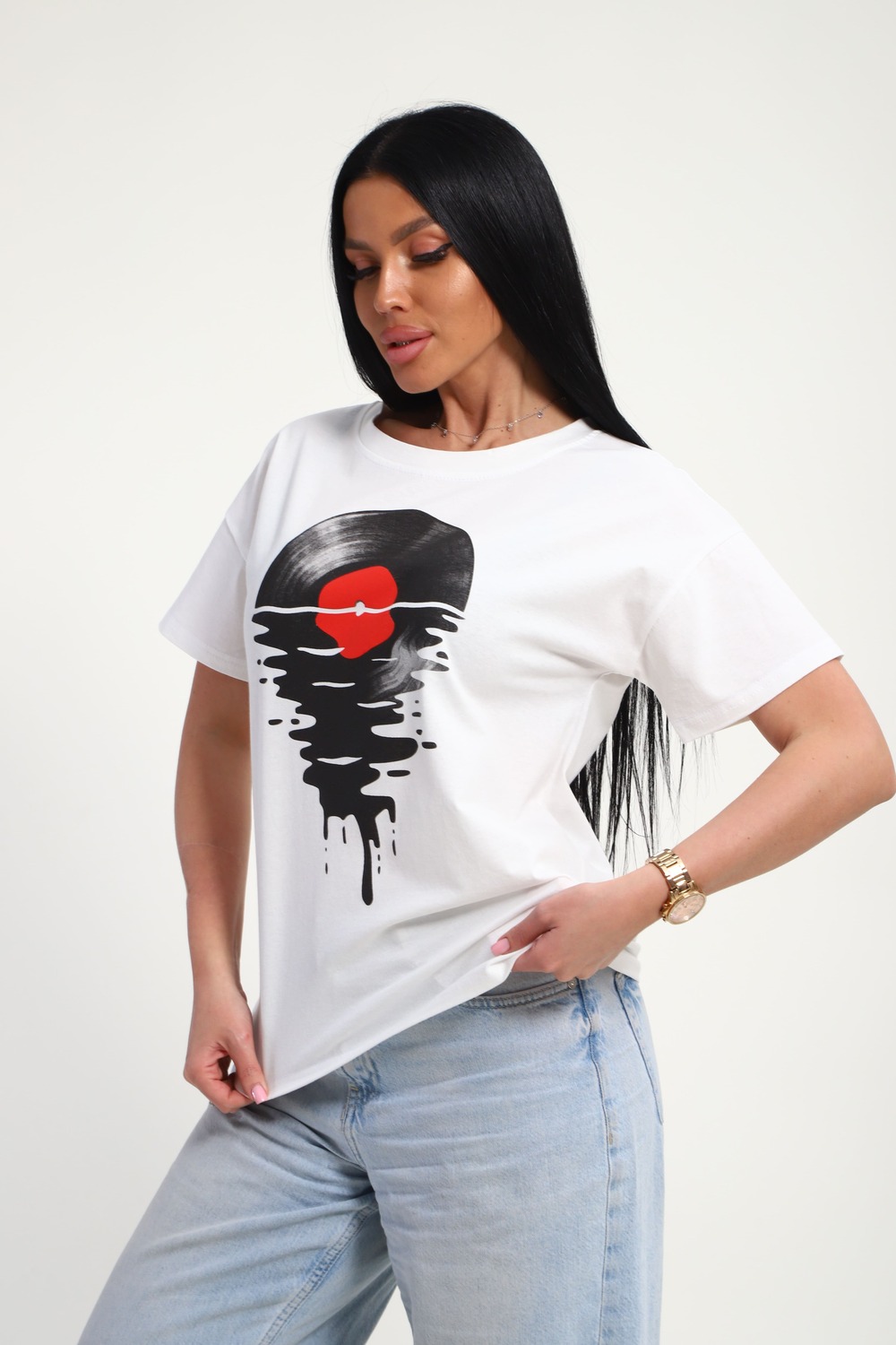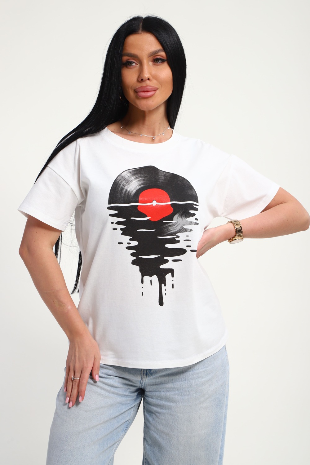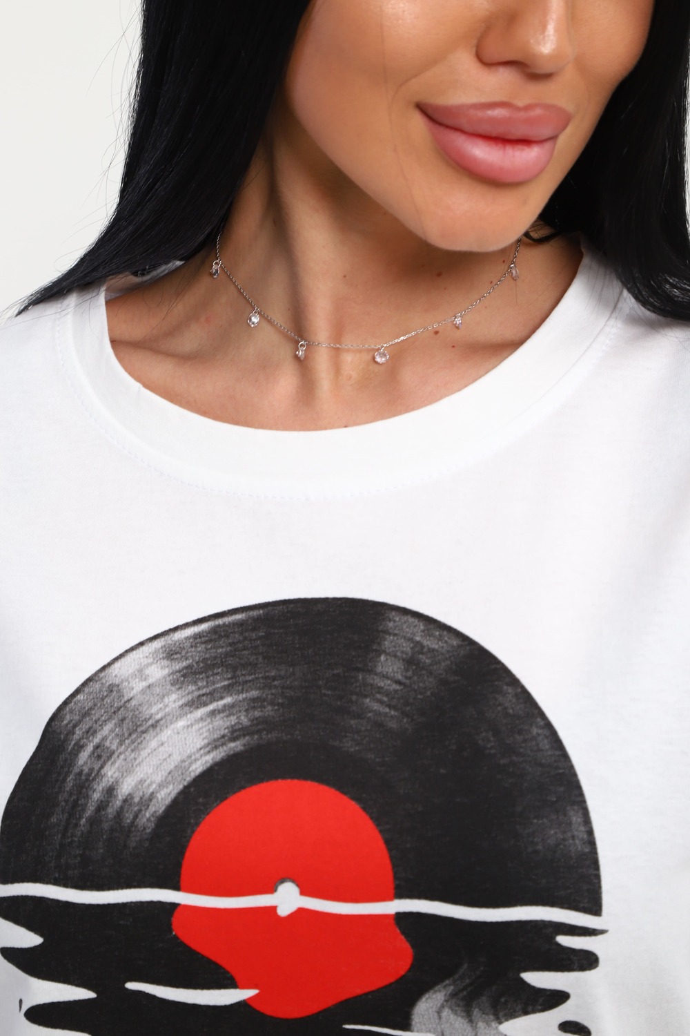 Футболка женская из гладкокрашенного трикотажа, хлопок 100%. Прямого силуэта, свободного облегания. горловина круглой формы. Рукав короткий. Низ изделия прямой. На полочке принт, шелкография. Цвет: белый; Материал: кулирка;кулирка; Состав: Хлопок 100%.