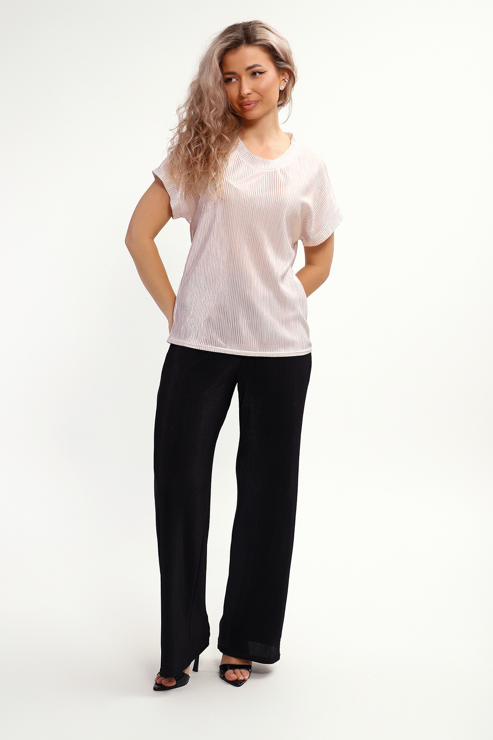 Стильная нарядная блузка, сочетающая в себе комфорт и элегантность. Благодаря свободному крою, блузка создает легкий силуэт и деликатно скрывает особенности фигуры. Добавляет изюминку изделию блестящая ткань с прочным напылением фойл, которое отлично держится на ткани после стирки. Ткань атлас гофре приятна на ощупь, хорошо тянется, не мнется, держит форму. Блузка смотрится и как офисная, и как вечерняя модель, а также это отличный вариант для летнего наряда. Округлая горловина, обработанная обтачкой, подчеркивает женственность образа, спущенный рукав не стесняет движений. Нарядная блузка позволит вам эффектно выглядеть не только на праздничных мероприятиях, но и в будни. Цвет: черный;экрю;жемчужно-белый; Материал: атлас стрейч;атлас стрейч; Состав: 98% ПЭ, 2%лайкра..