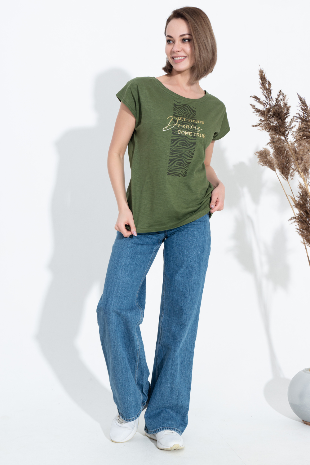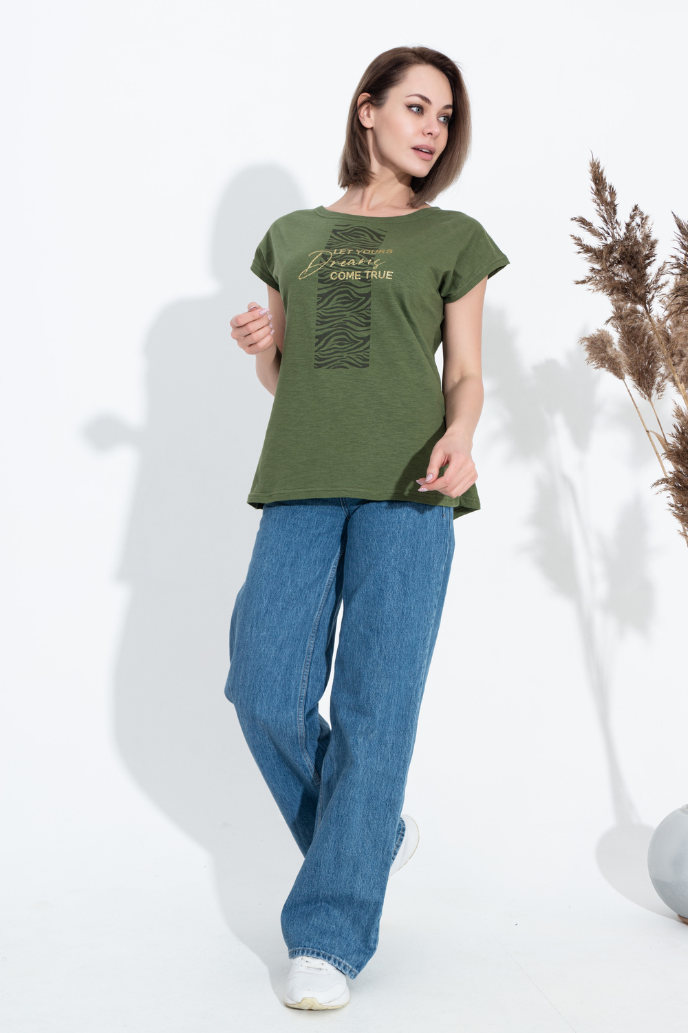 Футболка женская с коротким рукавом и круглым воротом. Изделие выполнено из высококачественной кулирки фламли в двух цветах. Оригинальный принт подчеркнет индивидуальность и позволит создать трендовый образ для ежедневного лука. Цвет: хаки;горчица; Материал: кулирка флам;кулирка флам; Состав: хлопок 100%.
