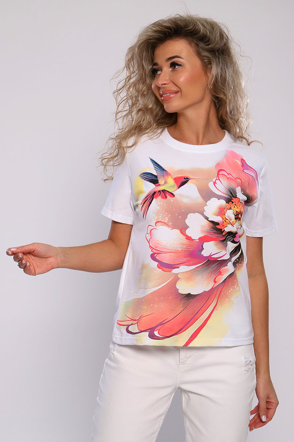 Футболка классического фасона, прямого кроя, с коротким рукавом и округлым вырезом. Декорирована принтом. Универсальная модель футболки отлично подойдет для любого образа и станет необходимой вещью в вашем гардеробе Цвет: белый; Материал: кулирка;кулирка; Состав: 100% хлопок.