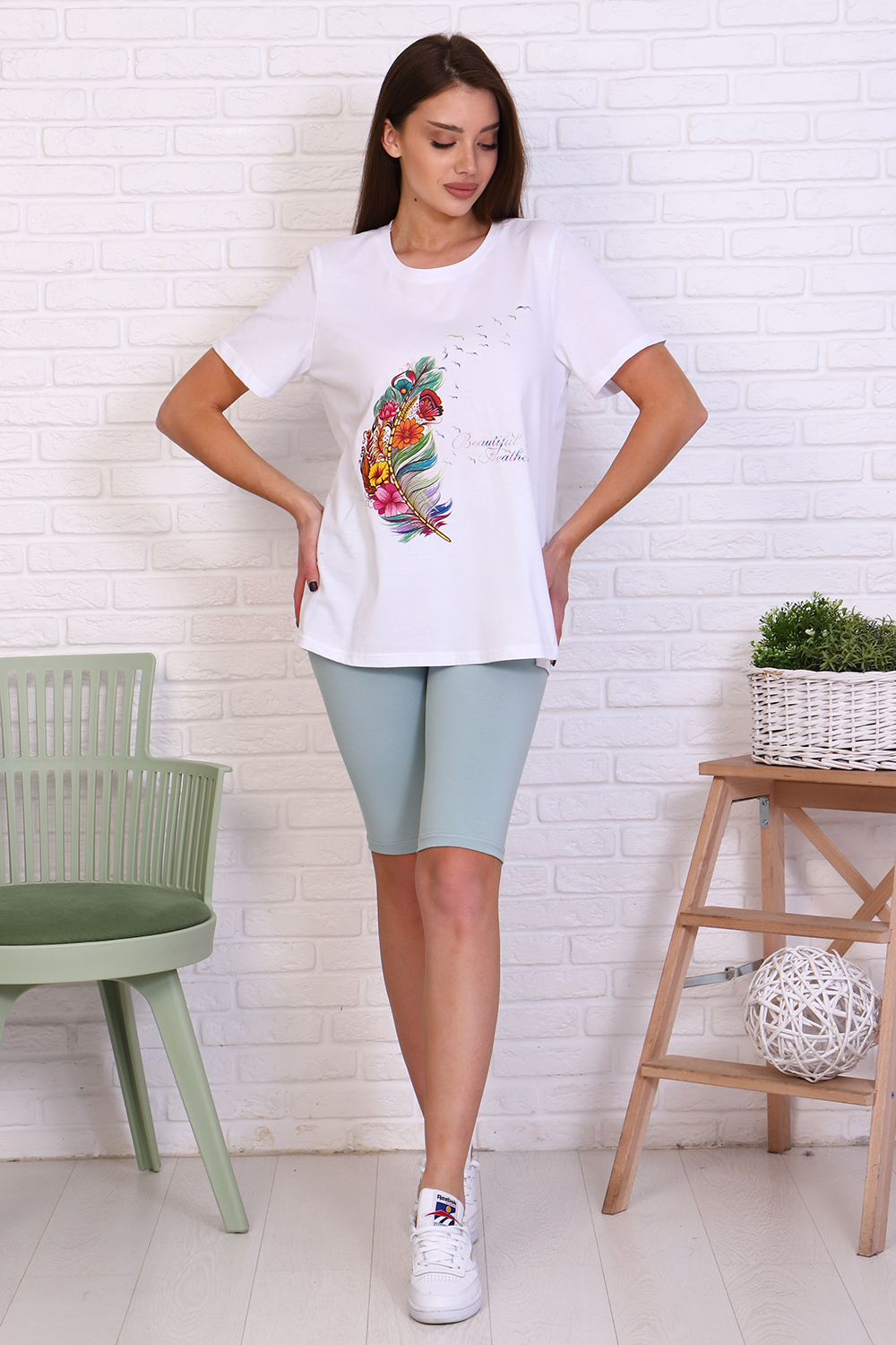 Молодежный костюм футболка и велосипедки. Футболка из кулирки 100% хлопок свободного кроя, стиль oversize, втачным коротким рукавом горловина округлой формы. На полочке изделия принт. Низ рукава и низ изделия подгибка. Велосипедки из кулирки с лайкрой облегающего силуэта без бокового шва. Низ изделия подгибка. Цвет: белый; Материал: кулирка;кулирка; Состав: верх: 100% хлопок, низ: 95% хлопок, 5%лайкра.