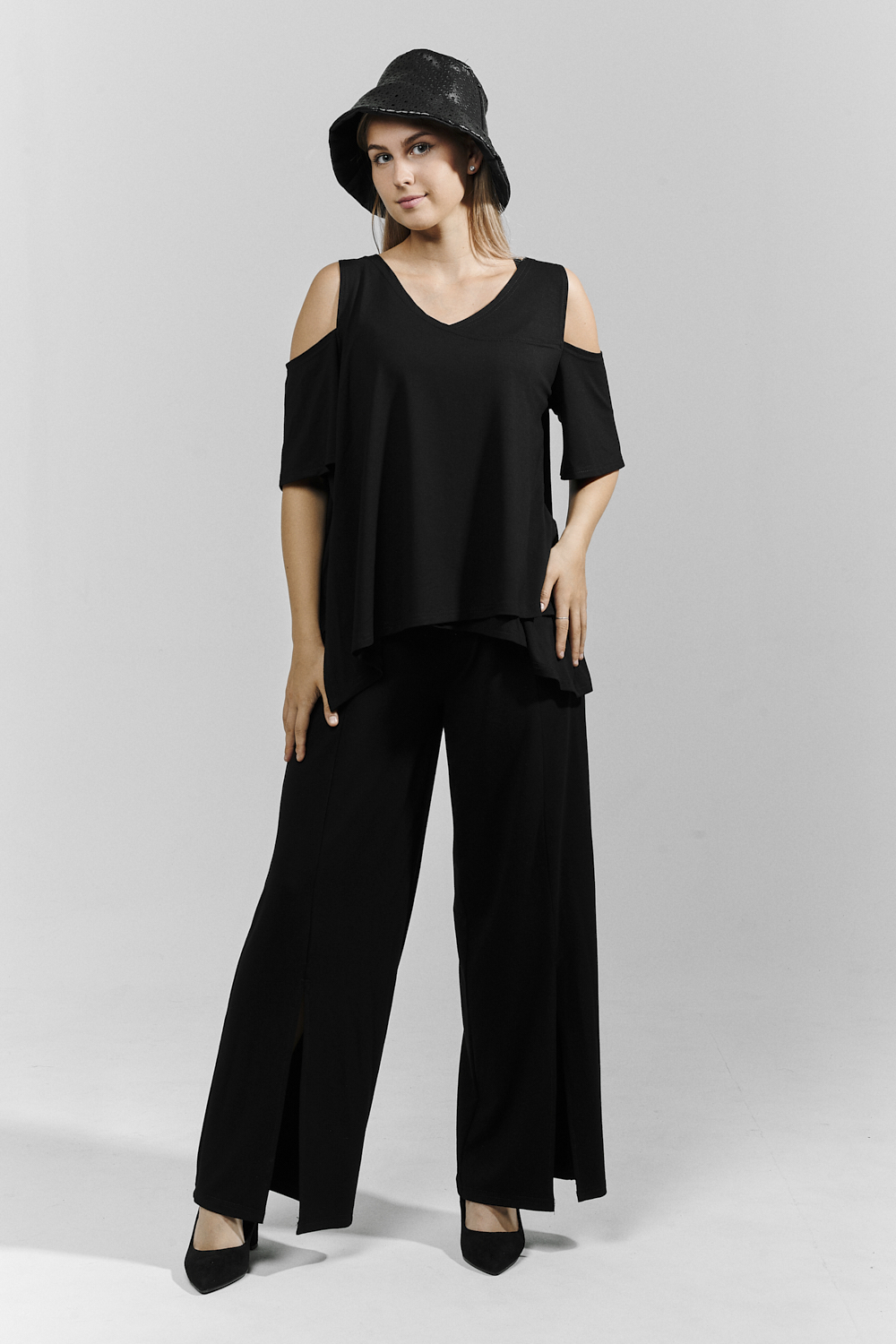 Костюм женский свободного силуэта. Рукав с открытым плечом. Брюки с разрезами по низу. Прекрасно будет смотреться на праздничном вечере Цвет: черный; Материал: вискоза пенье;вискоза пенье; Состав: вискоза 92%, лайкра 8%.