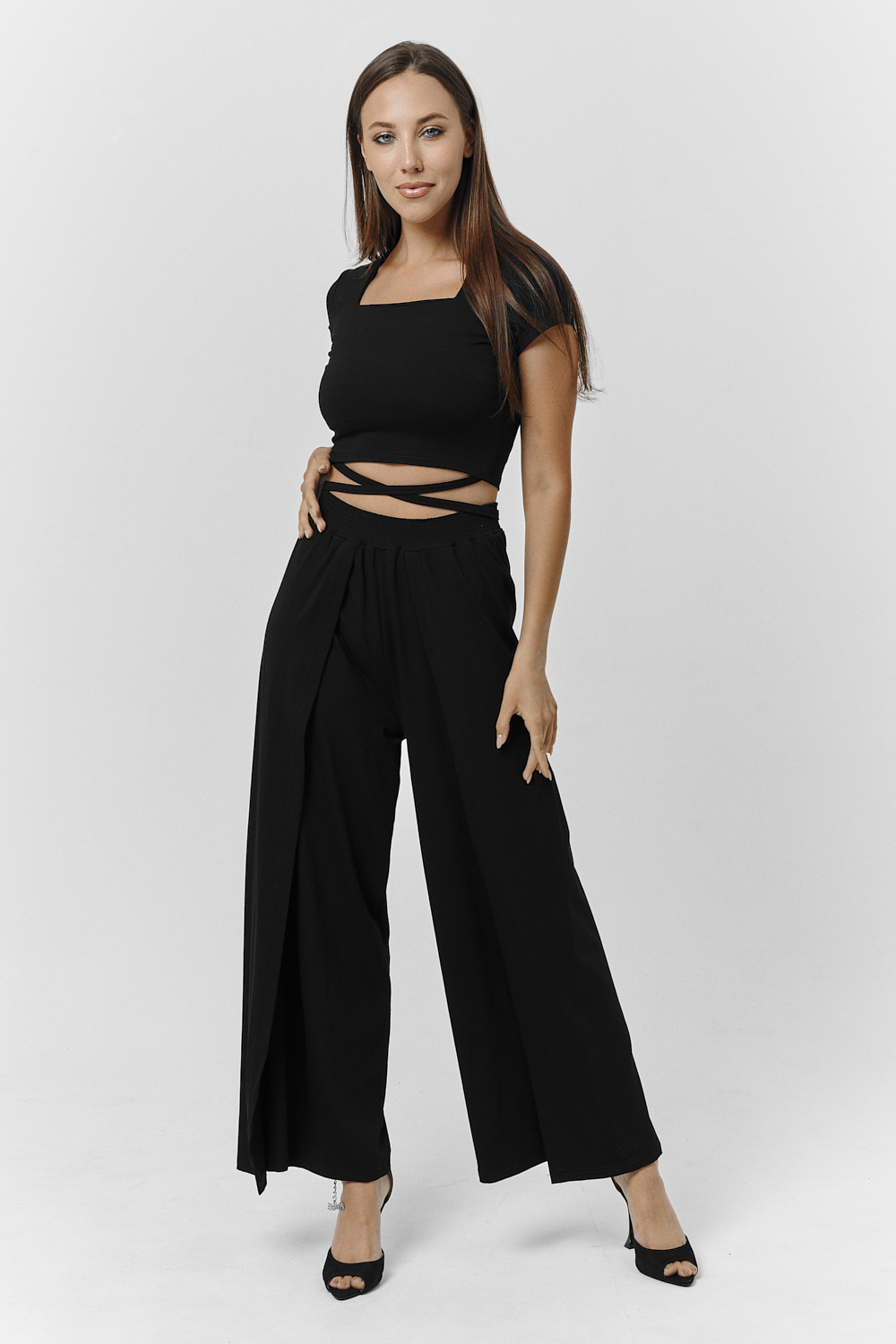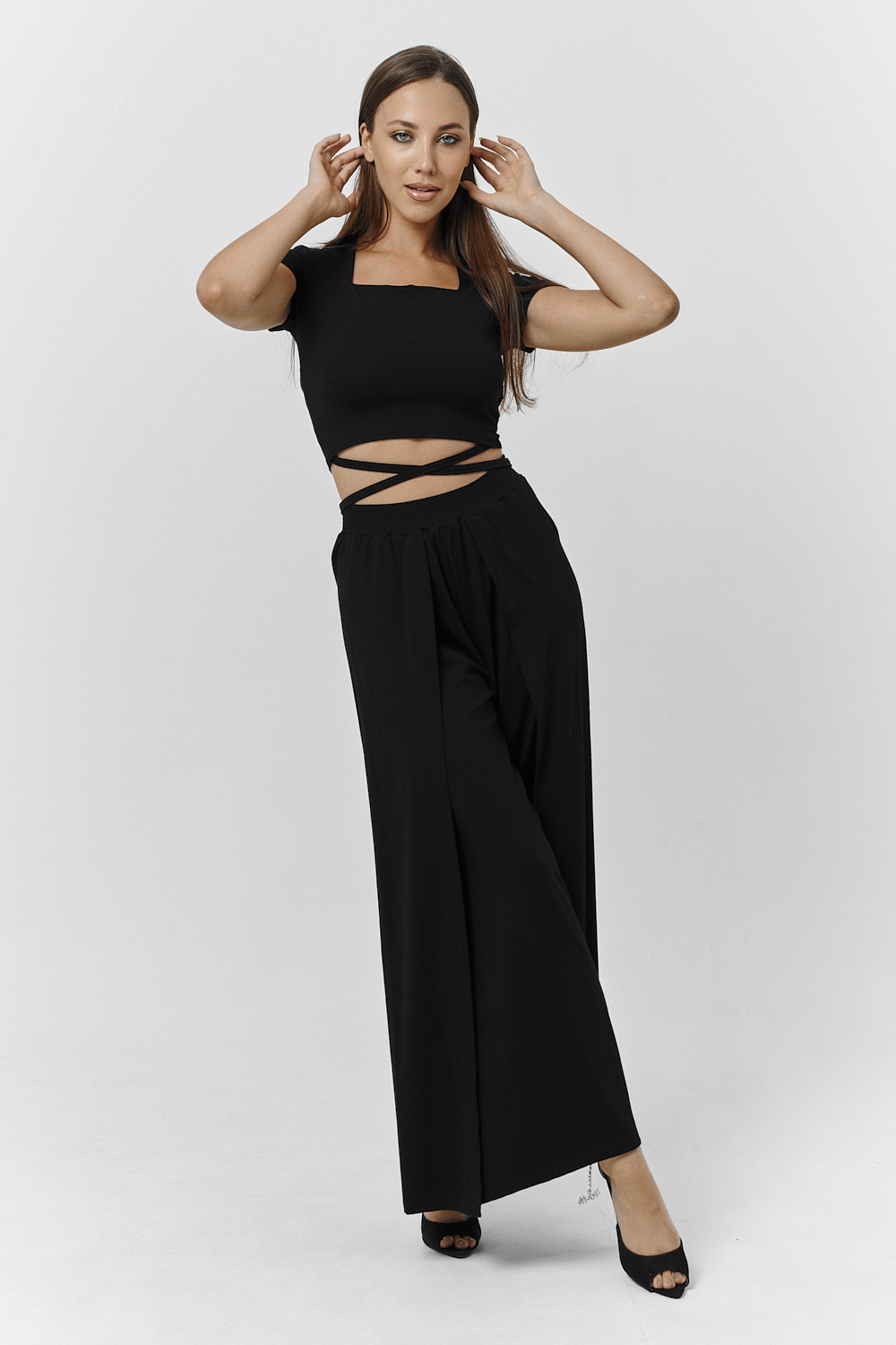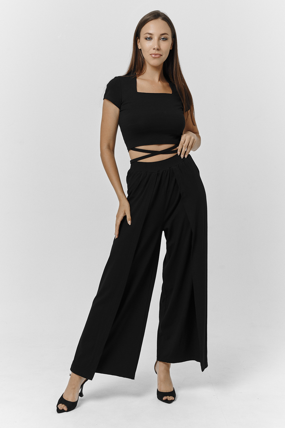Костюм женский. Футболка прилегающего силуэта, брюки свободные, без боковых швов. Нарядный вариант для праздничного вечера Цвет: черный; Материал: вискоза;вискоза; Состав: вискоза 92%, лайкра 8%.