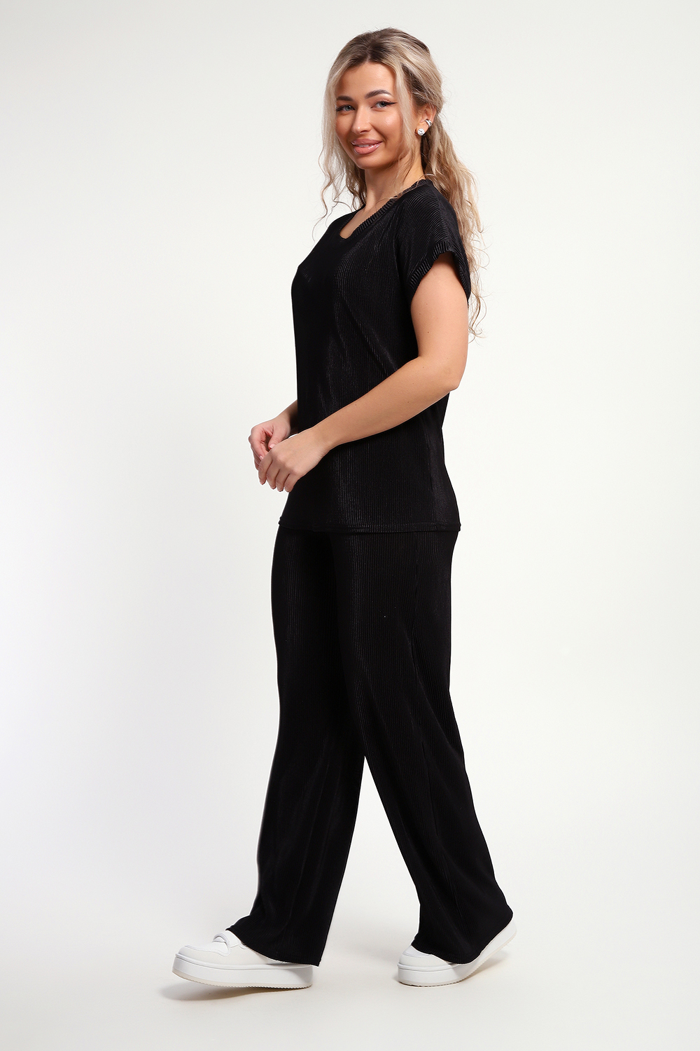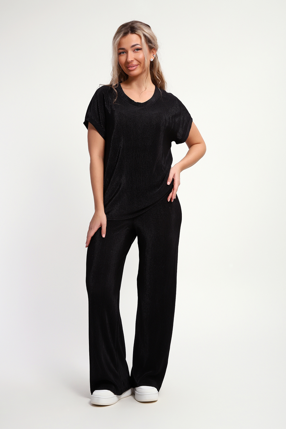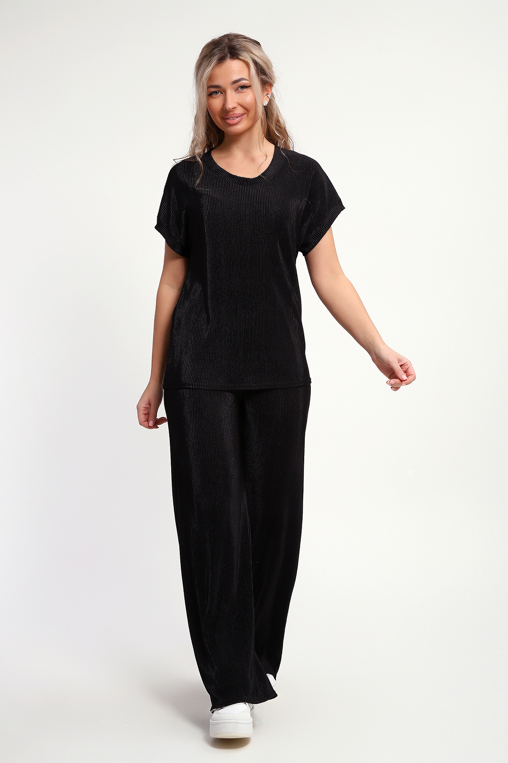 Универсальный женский костюм двойка, сочетающий в себе комфорт и элегантность. Модель выполнена из легкой приятной на ощупь ткани - атлас гофре, которая имеет гофрированную поверхность в рубчик , не мнется, держит форму, проста в уходе. Этот трикотажный костюм включает в себя футболку и широкие брюки палаццо. В нем вы будете себя комфортно чувствовать и дома, и на прогулке, на отдыхе, и на работе. Футболка со спущенным рукавом, что обеспечивает свободу движения, округлая горловина обработана обтачкой. Длина футболки ниже линии бедра. Брюки свободного кроя, слегка расклешенные книзу, удобный пояс на резинке. Стильный комфортный костюм, в котором удобно отдыхать, подчеркнет ваш вкус даже в простых вещах. Цвет: черный; Материал: атлас стрейч;атлас стрейч; Состав: 98% п/э, 2% лайкра.