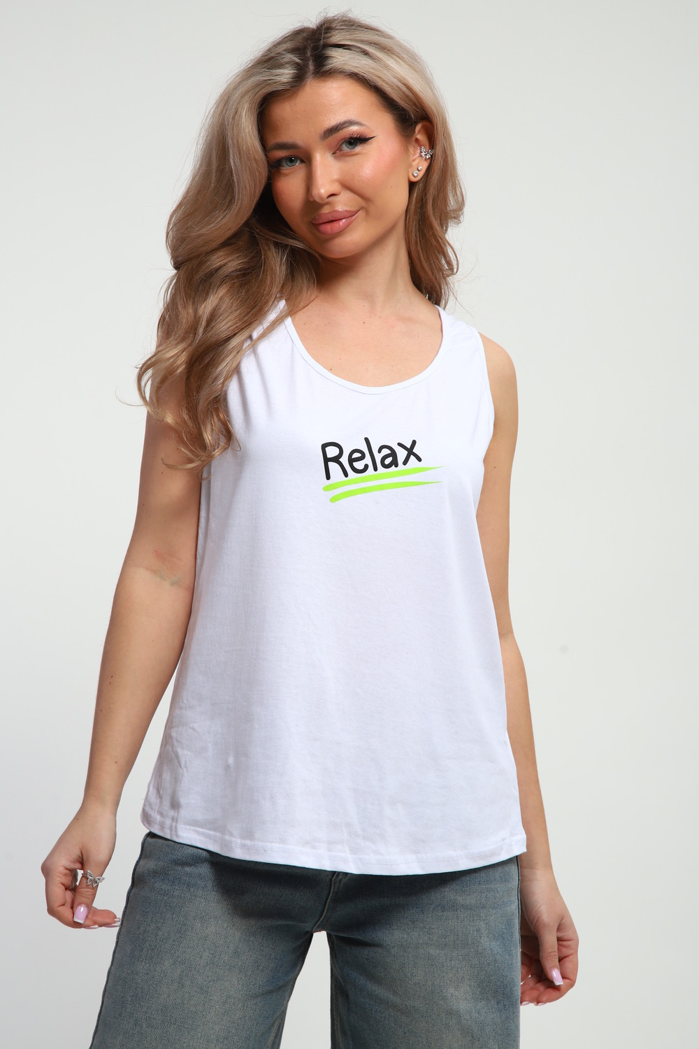 Майка женская с принтом. Данная модель выполнена из трикотажного полотна кулирка. Цвет: белый; Материал: кулирка; Состав: хлопок 100%.