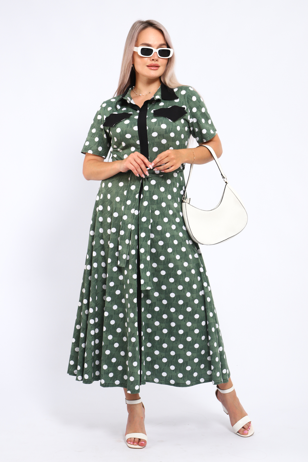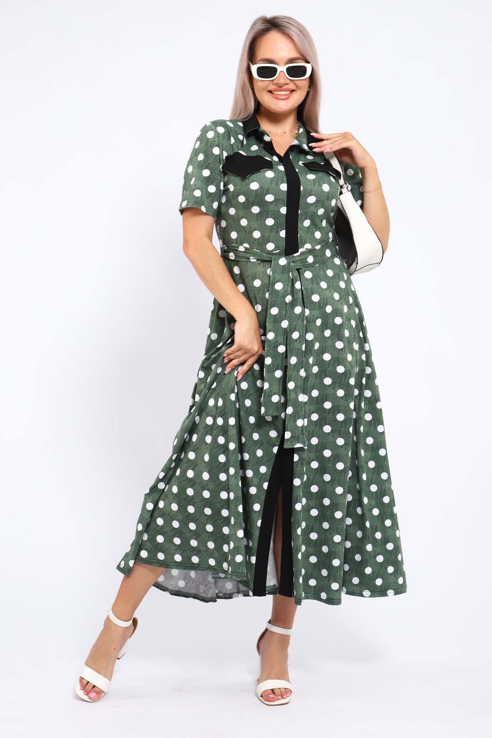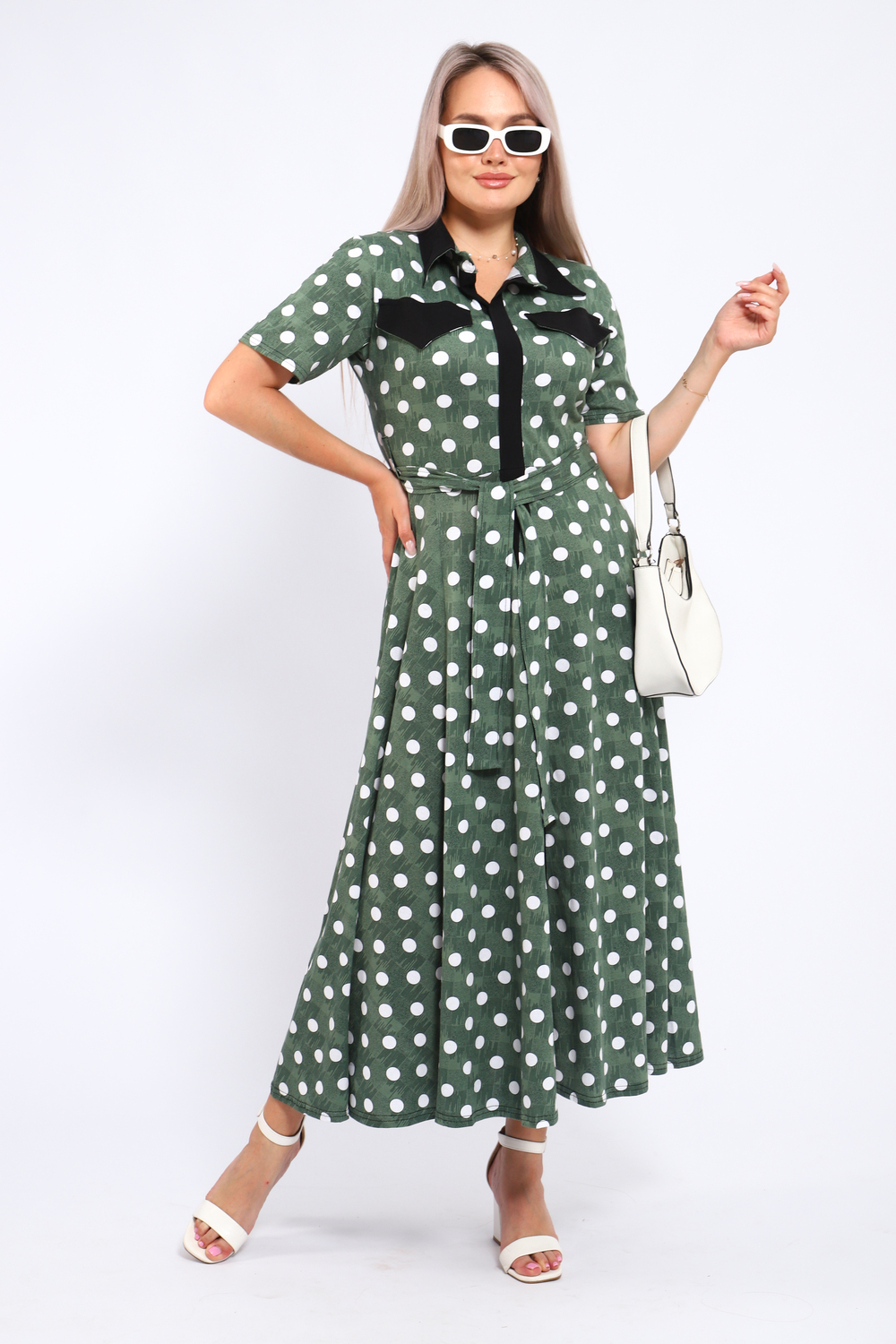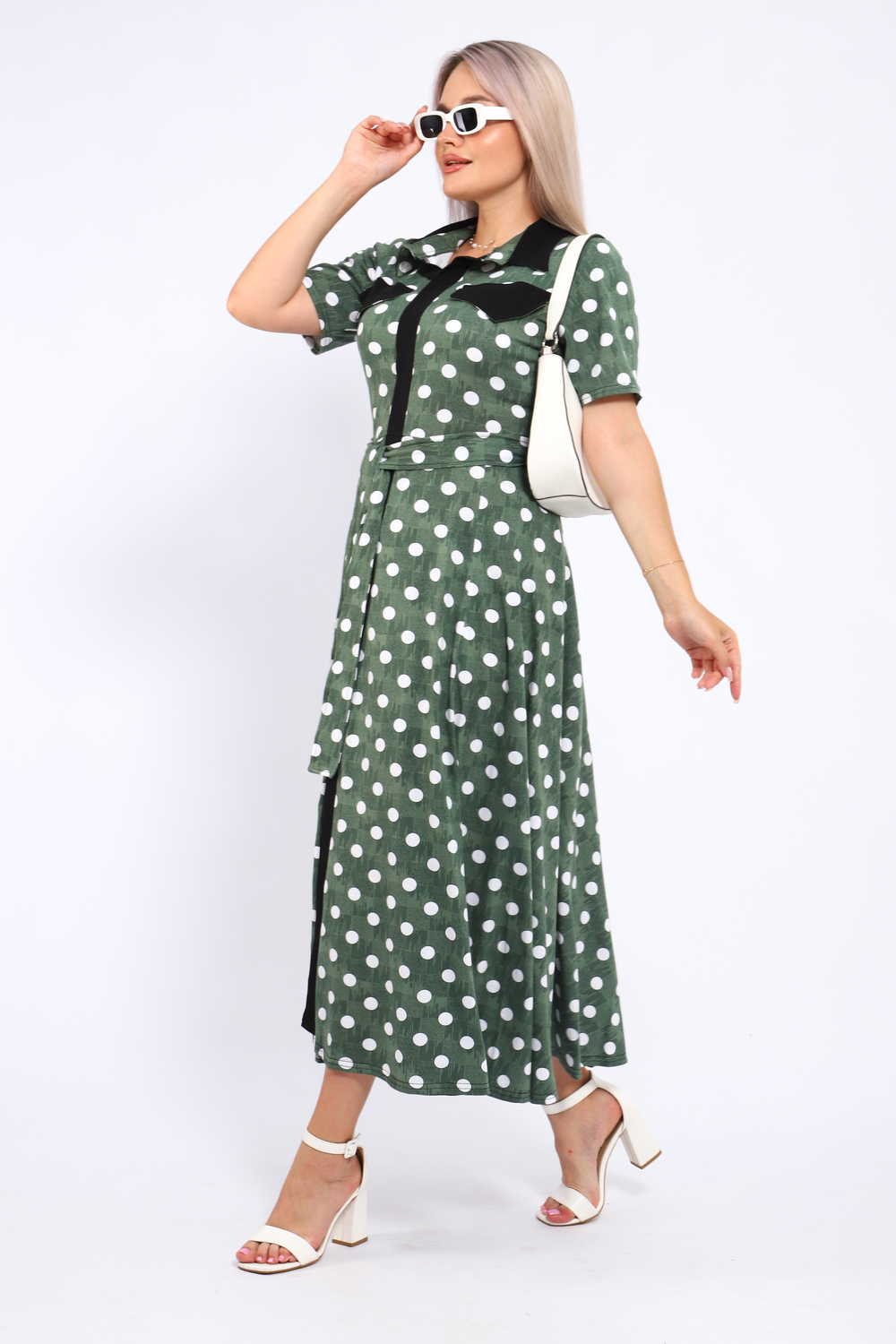 Платье, которое сочетает в себе комфорт и уникальный дизайн. Модель выполнена из мягкого материала, что делает её идеальной для повседневной носки. Свободный крой с расклешённой юбкой и акцент на талии с помощью пояса создают воздушный и женственный силуэт. Контрастное сочетание жёлтого и чёрного в гороховом принте смелое и при этом очень гармоничное решение. Это платье отличный выбор для прогулок, встреч с друзьями или офиса. Носите его с босоножками на каблуке для создания изысканного образа или с кедами для более расслабленного стиля. Цвет: зеленый;желтый; Материал: кулирка;кулирка; Состав: 100% хлопок.