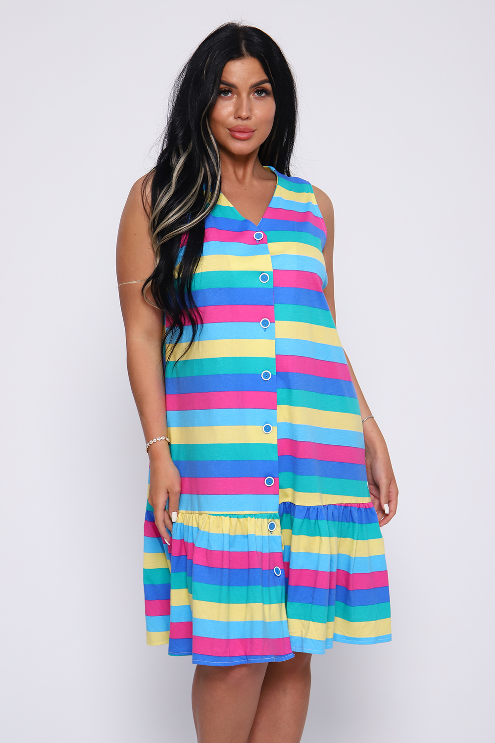 Яркий сарафан, без рукавов прямой крой, внизу кокетка - рюша, на пуговицах. Цвет: радуга; Материал: кулирка;кулирка; Состав: 100% хлопок.