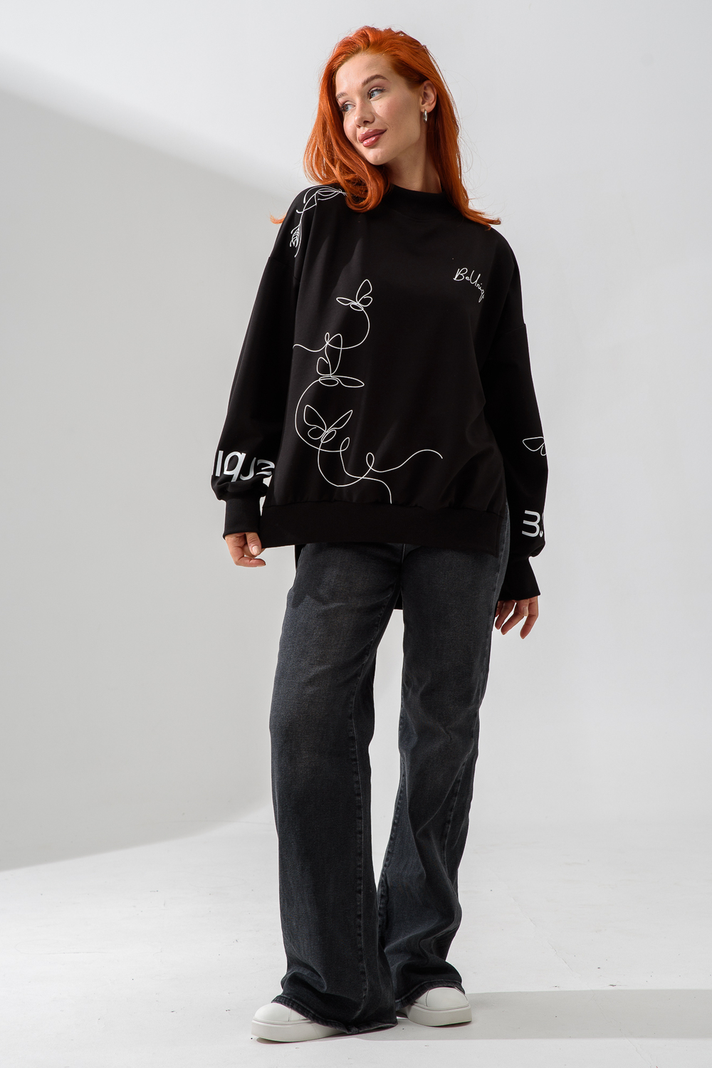 Женский свитшот оверсайз в универсальном черном цвете! Эта модная удлиненная толстовка не просто согреет вас в прохладную погоду, но и подчеркнет вашу индивидуальность благодаря уникальному дизайну и вдохновляющей надписи. На груди расположена стильная надпись Be Unique (Будь уникальной), которая вдохновляет и добавляет изделию индивидуальности. По рукавам и по бокам свитшот украшен минималистичным линейным рисунком в виде изящных бабочек и абстрактных линий. Свитшот с высокой горловиной (или воротником-стойкой) обеспечивает дополнительную защиту от ветра и холода. .Модный удлиненный силуэт с элегантными боковыми разрезами по низу делает свитшот более динамичным и позволяет носить его как навыпуск, так и частично заправленным. Разрезы также добавляют свободы движений. Теплый свитшот отлично пропускает воздух, сохраняет форму после стирок и обеспечивает комфорт в течение всего дня