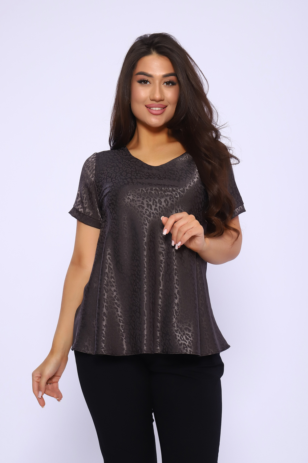 Очаровательная женственная блузка из армани-шелка жаккард. Ткань прекрасно драпируется, имеет красивый блеск, не электризуется. Благодаря этим свойствам ткани и крою по косой, блузка отлично садится на фигуру, а складки полочки и спинки красиво переливаются. Расклешенный силуэт, округлая горловина обработана обтачкой, короткий рукав с манжетом дополняют образ. Блузка представлена в двух базовых расцветках, с ее помощью вы составите и деловой, и праздничный, и повседневный ансамбль одежды.