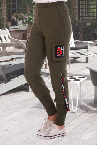 Спортивные брюки, полуприлегающего силуэта на эластичном поясе,низ брюк на широких притачных манжетах. по боковым швам расположенны накладные карманы и декоративная лента.