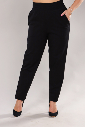 Брюки на поясе, с боковыми карманами вверху, накладными карманами с клапаном по бокам, внизу на резинке.
